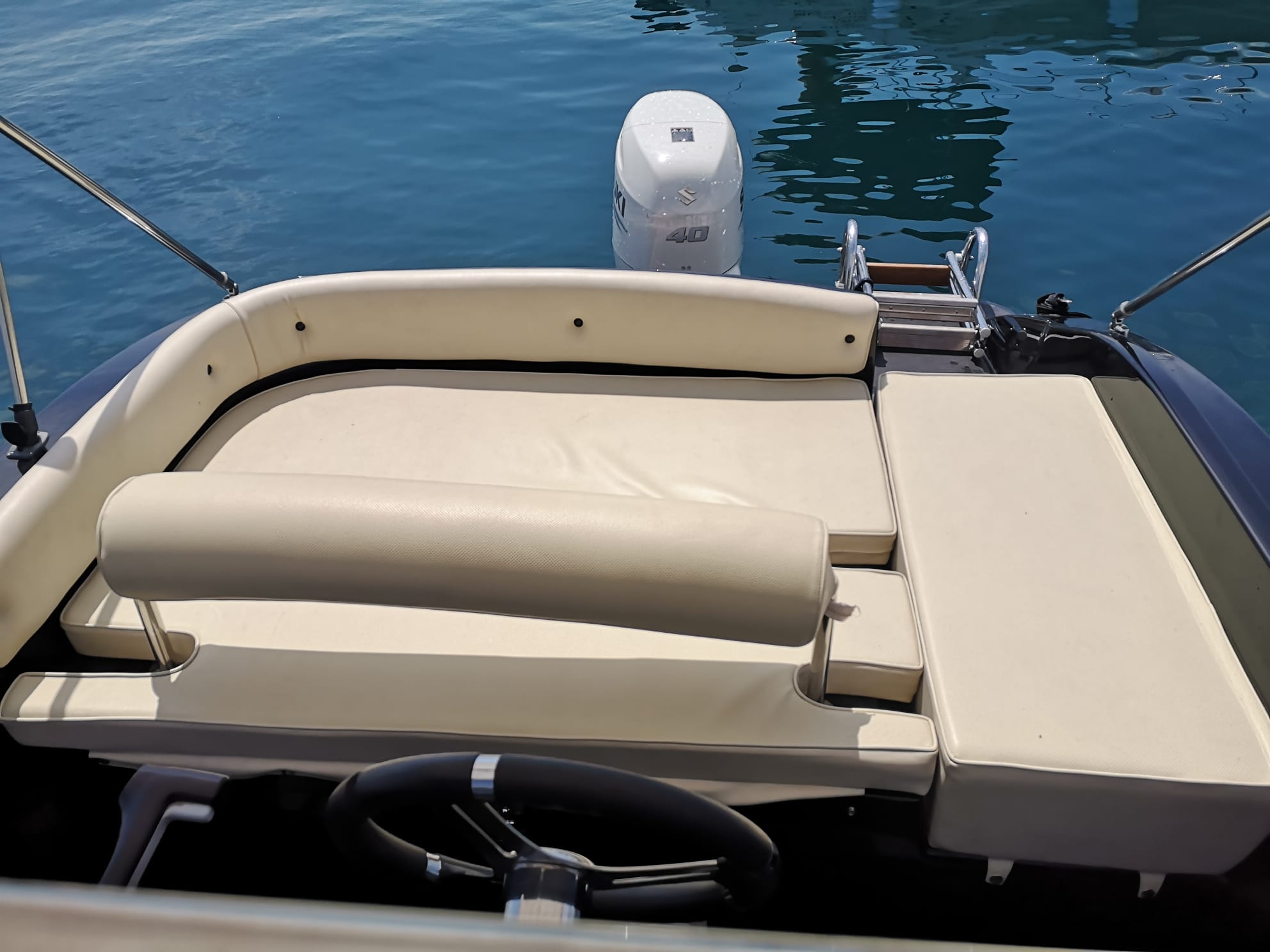 Offenes Konsolenboot mit hohem Rumpf und optimalem Fahrverhalten, kommt leicht und schnell in Gleitfahrt auch bei minimaler Motorisierung. Komfortable Liege- und Sitzflaechen fuer insgesamt bis zu 7 Personen. Grosse Liegeflaeche im Bug, Sitz vor der Konsole, Fahrersitz mit regulierbarer Rueckenlehne fuer bequemes Fahren im Sitzen und Stehen, zusaetzliche Sonnenliege hinter Fahrerbank.