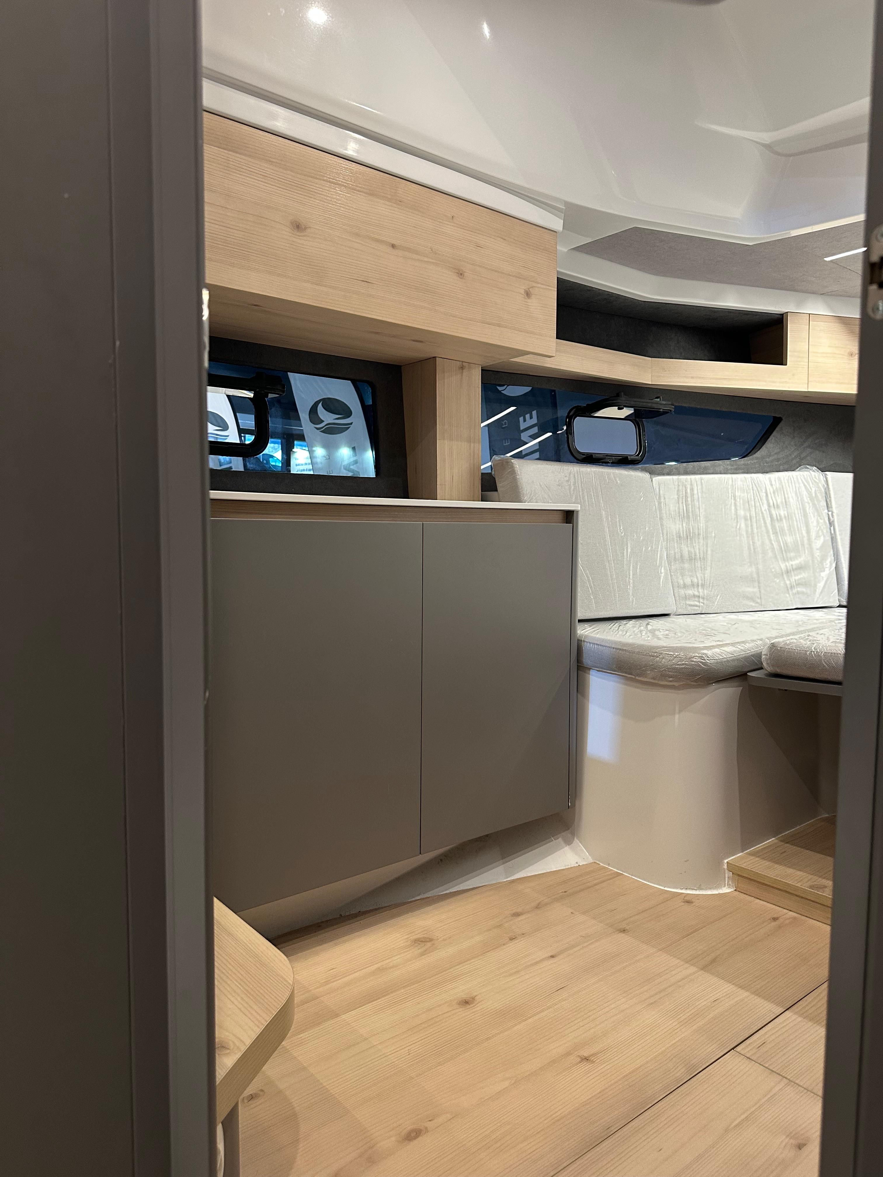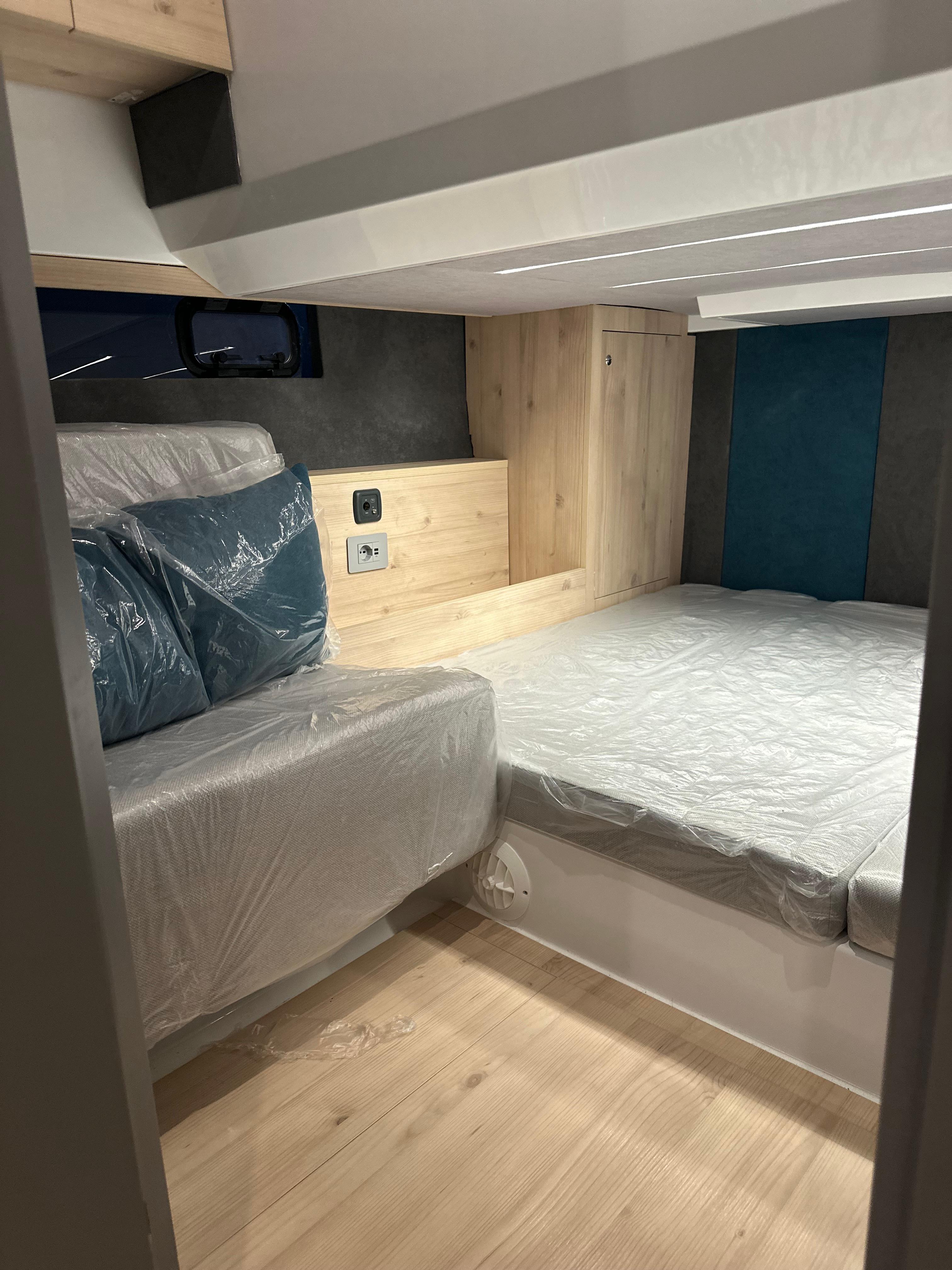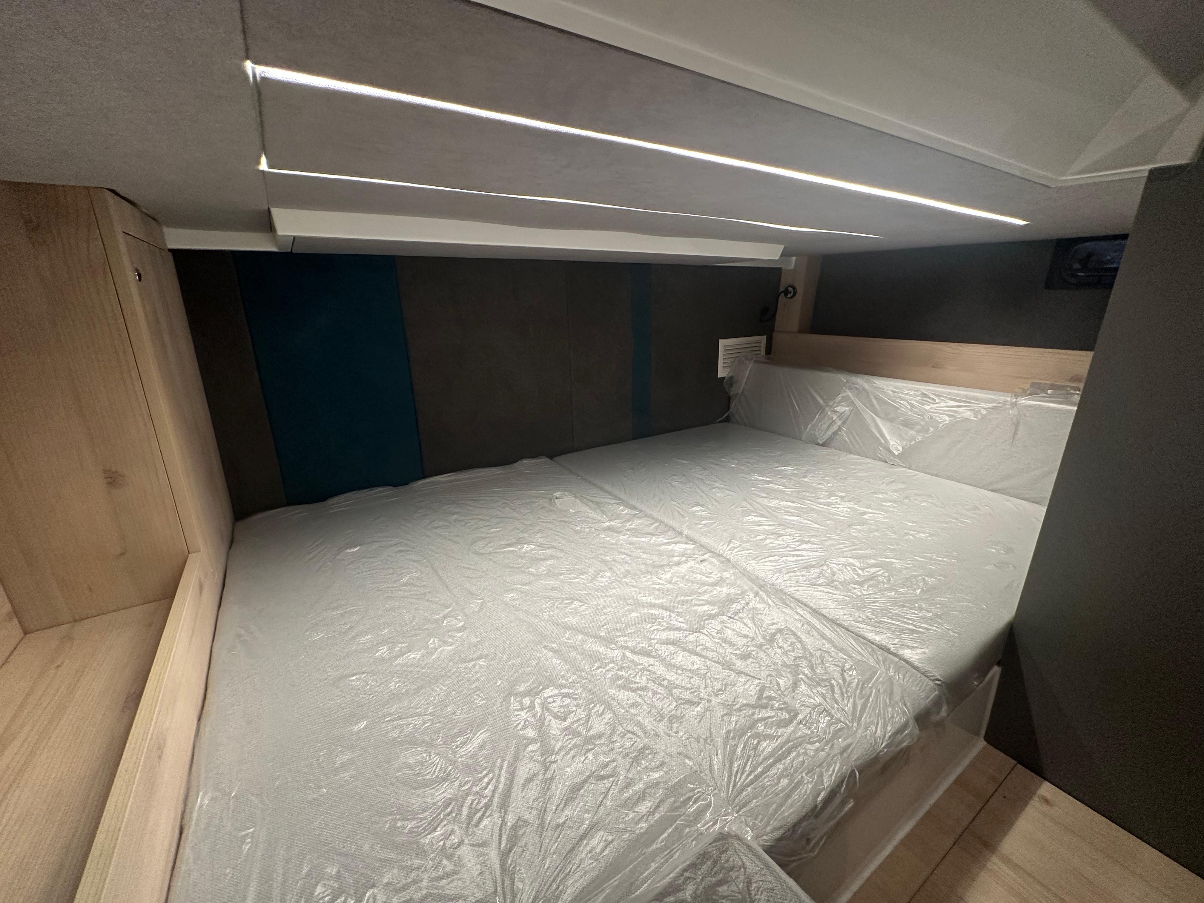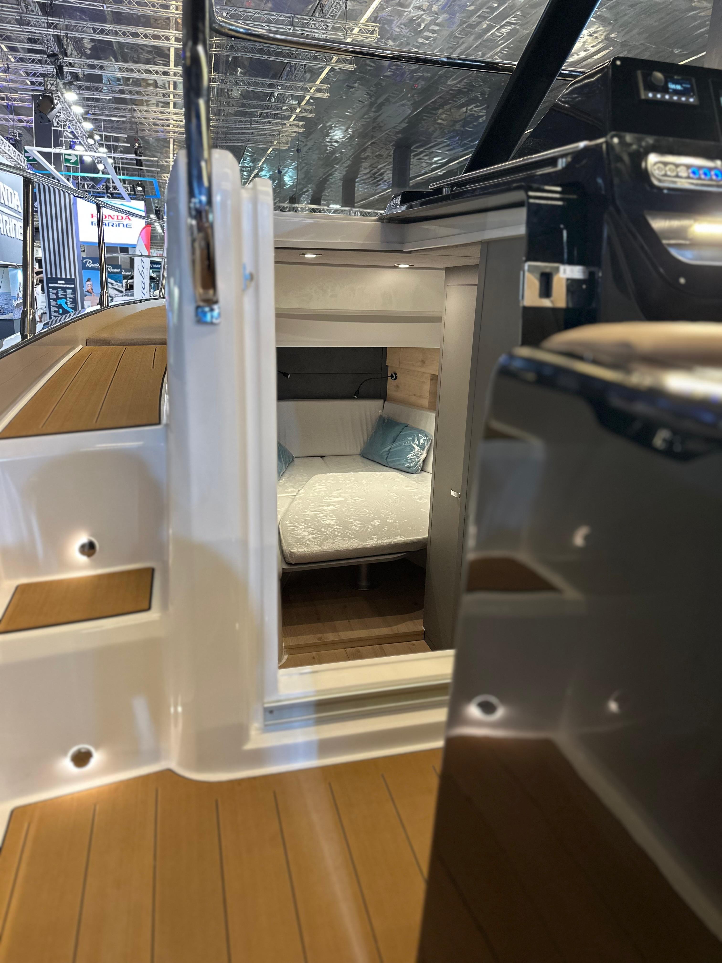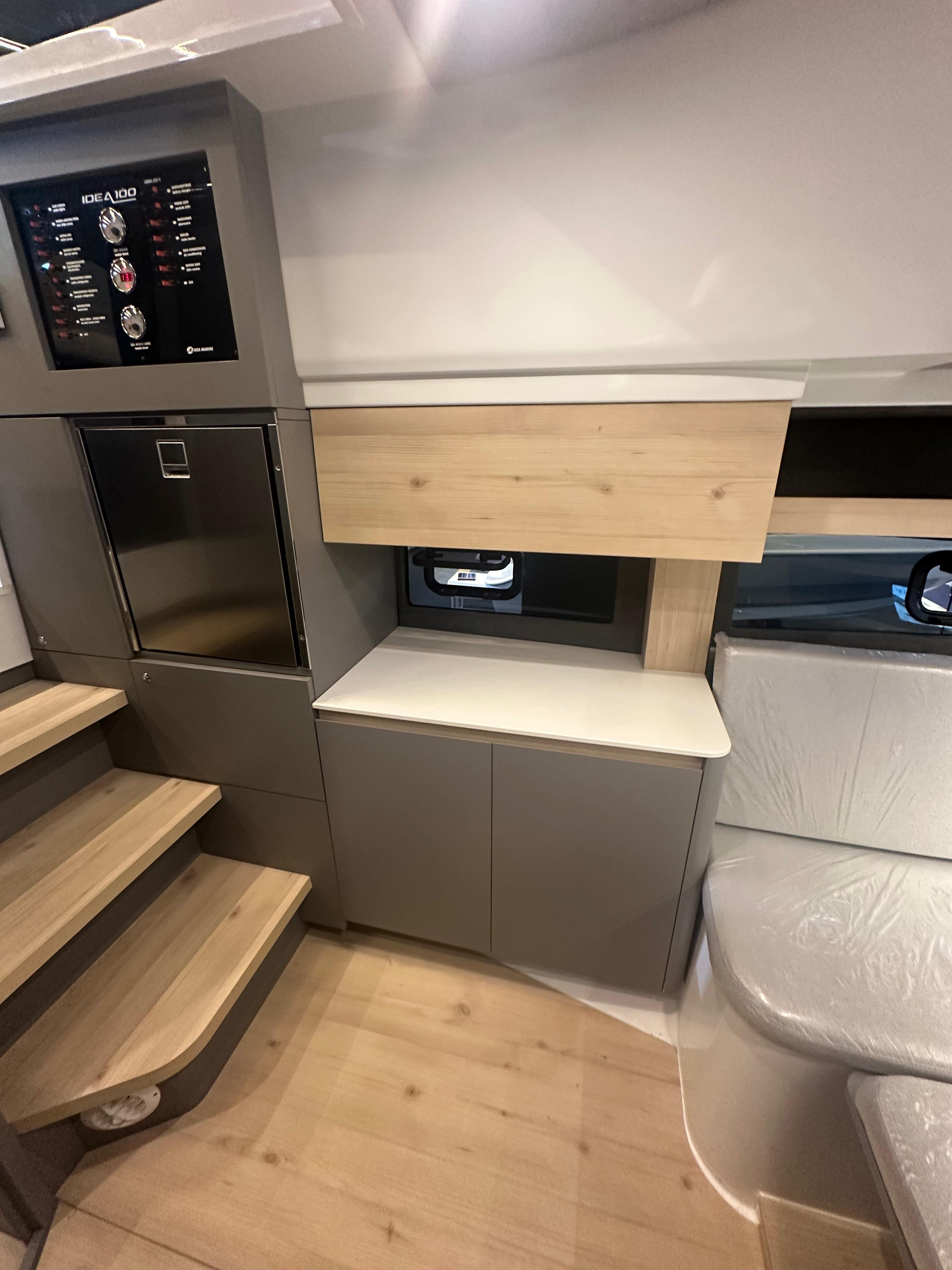 Una caratteristica innovativa e unica per un walkaround di queste dimensioni sono le terrazze laterali abbattibili (optional) - le più grandi in questa categoria di scafi - creando cosi un' estensione del pozzetto utilizzabile come comode piattaforme da bagno o zone relax. Mobile wetbar con 3 sportelli, optional: frigorifero, ice maker, piano cottura a induzione, piano cottura a gas o grill elettrico. Ampio prendisole a prua. Cabina 4 posti letto con bagno separato.