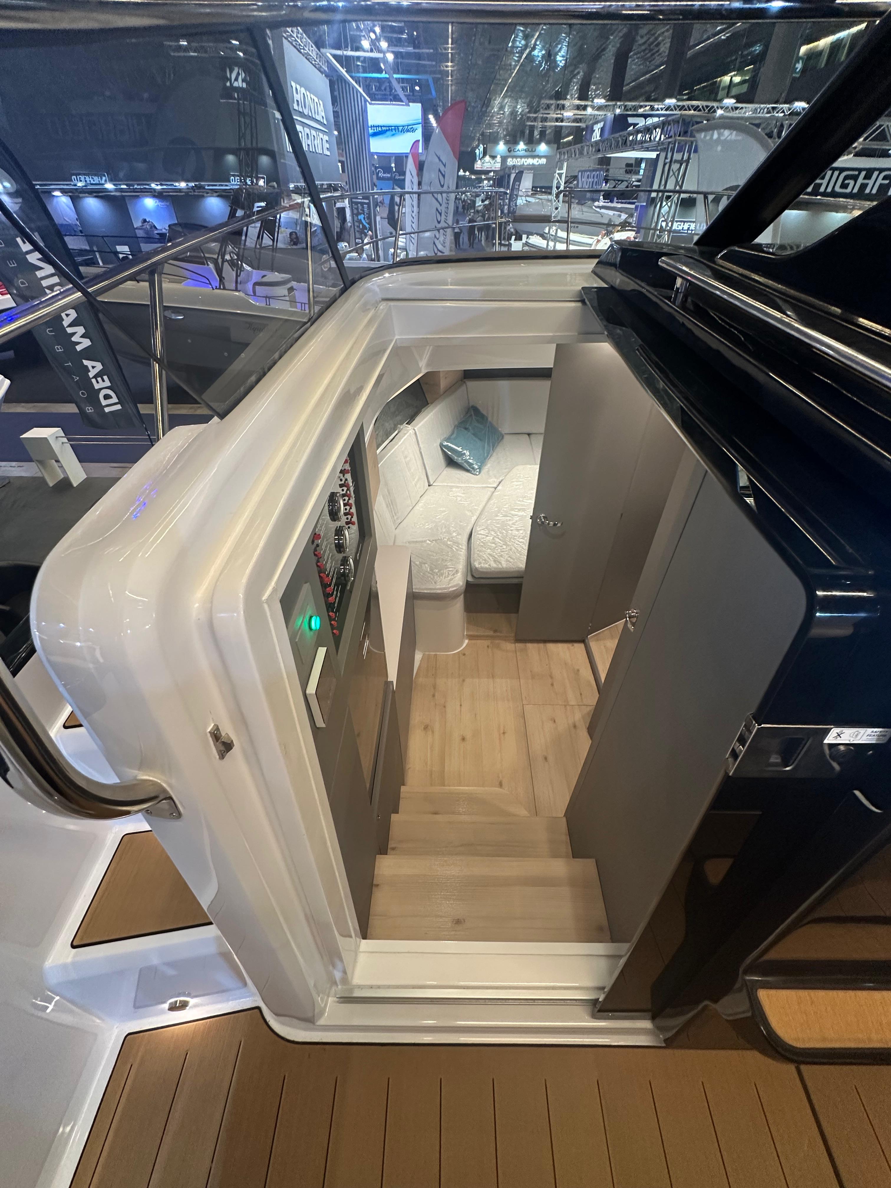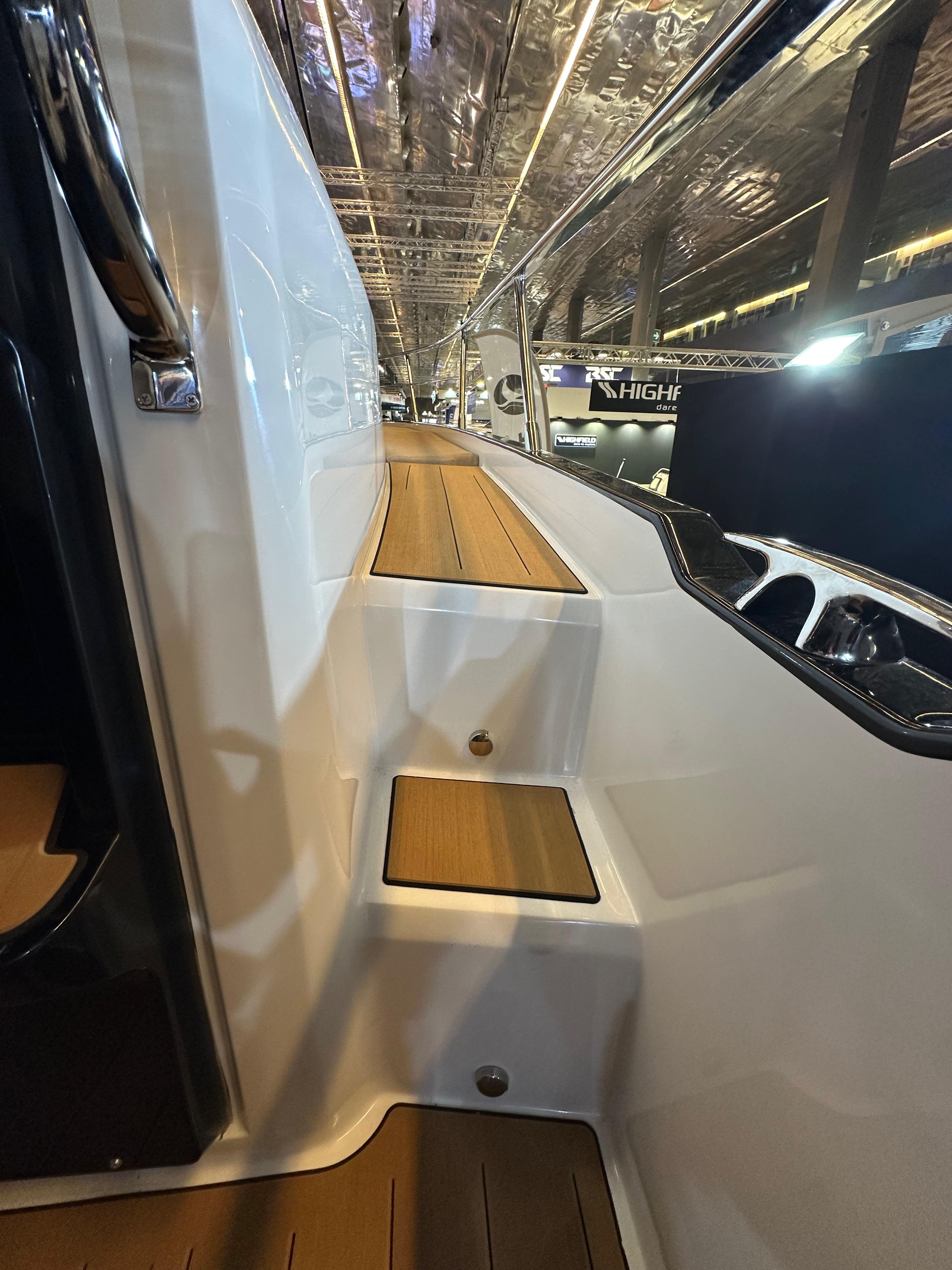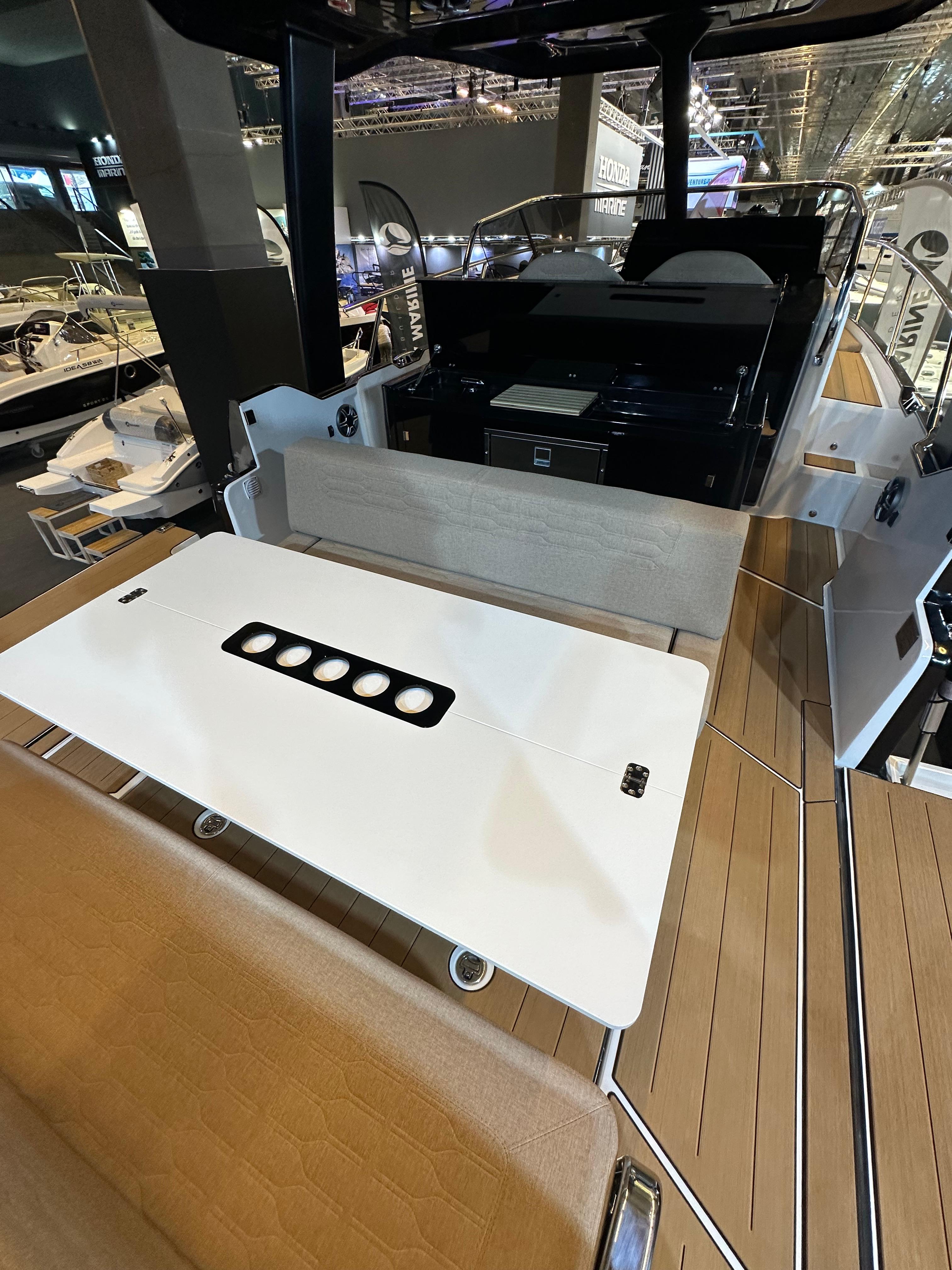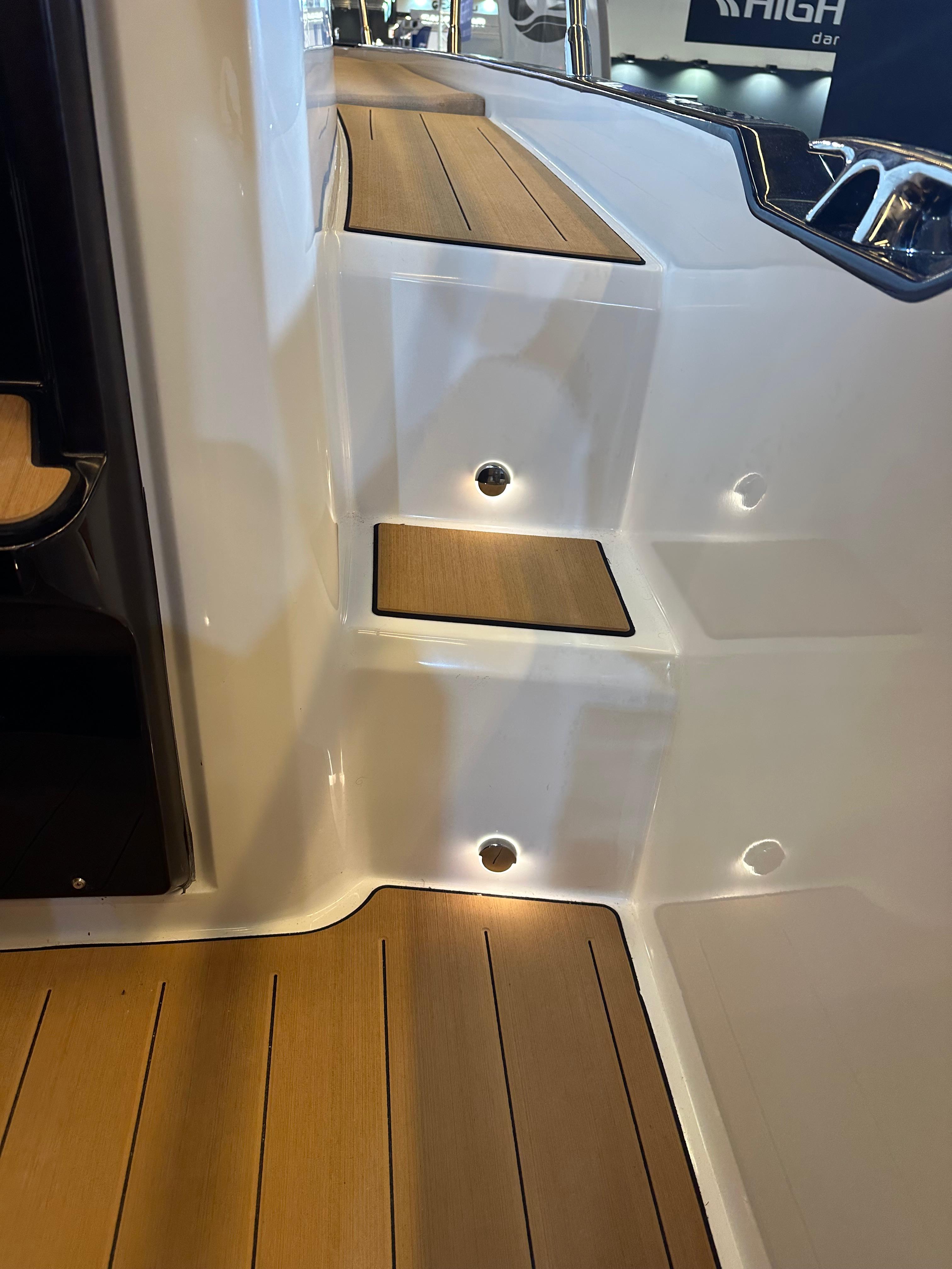 Una caratteristica innovativa e unica per un walkaround di queste dimensioni sono le terrazze laterali abbattibili (optional) - le più grandi in questa categoria di scafi - creando cosi un' estensione del pozzetto utilizzabile come comode piattaforme da bagno o zone relax. Mobile wetbar con 3 sportelli, optional: frigorifero, ice maker, piano cottura a induzione, piano cottura a gas o grill elettrico. Ampio prendisole a prua. Cabina 4 posti letto con bagno separato.