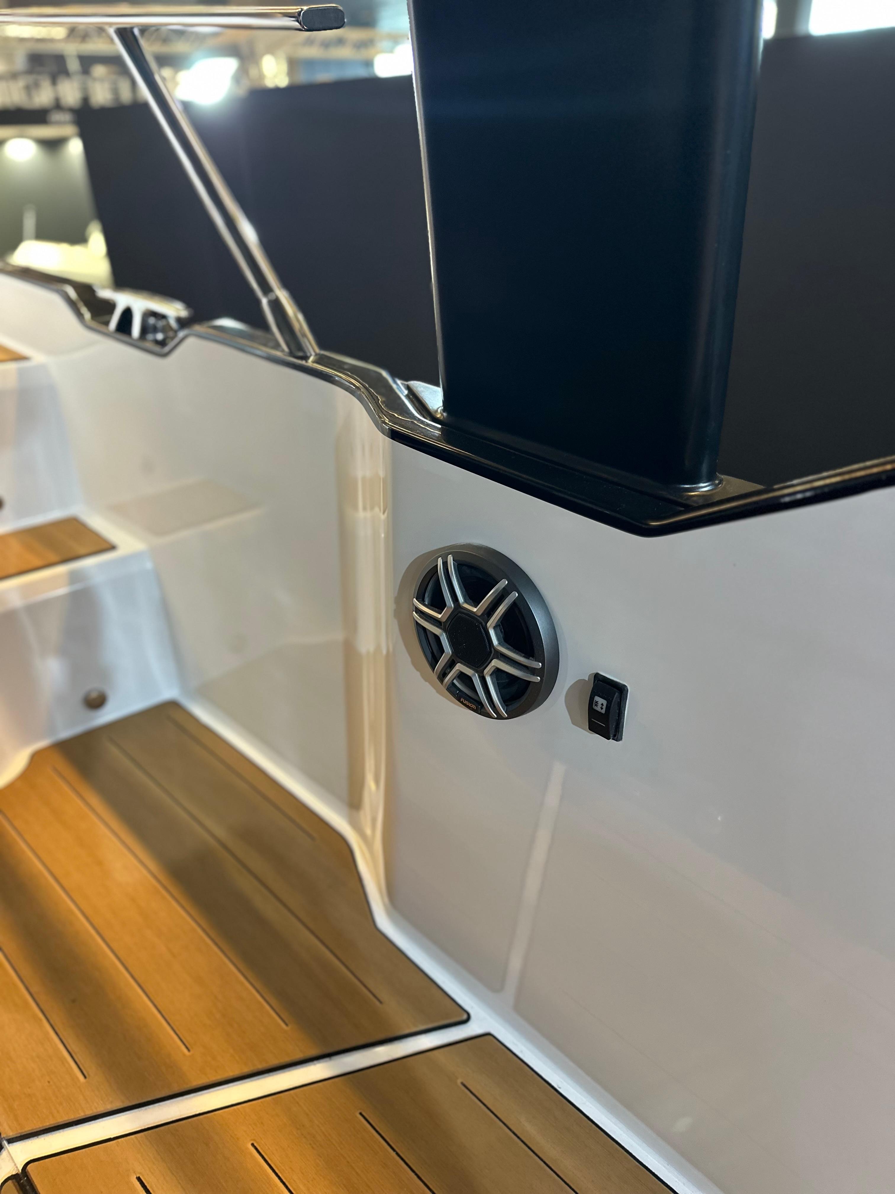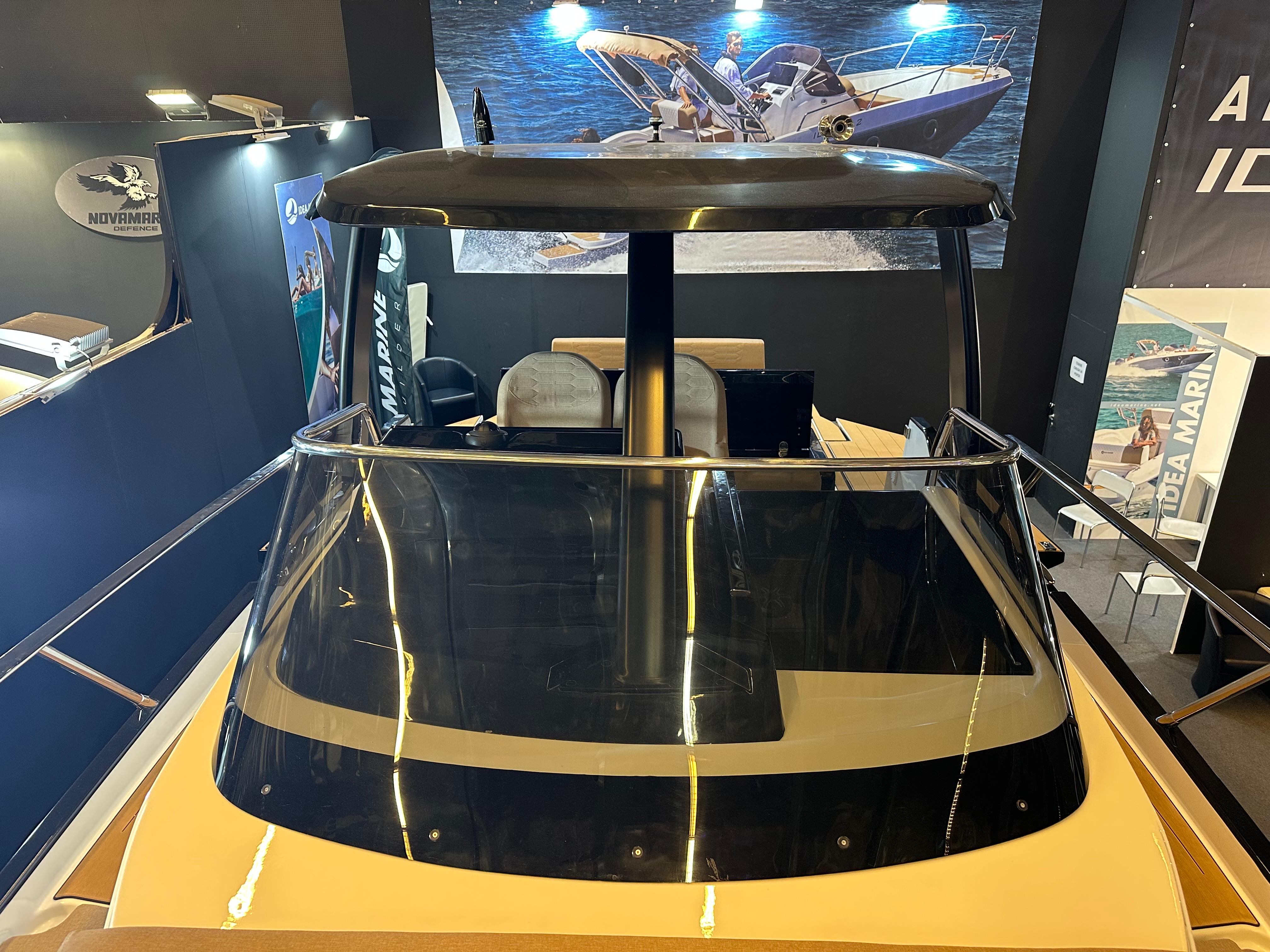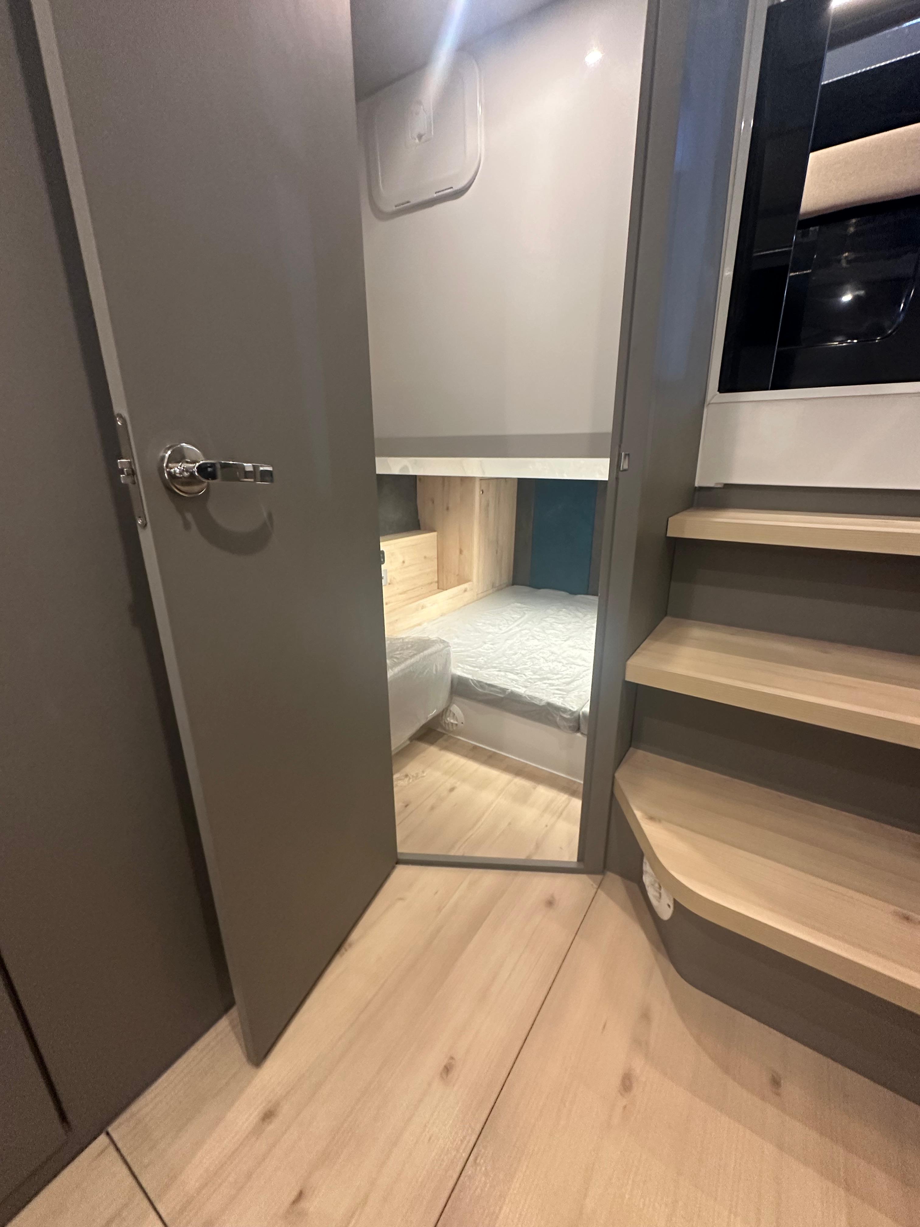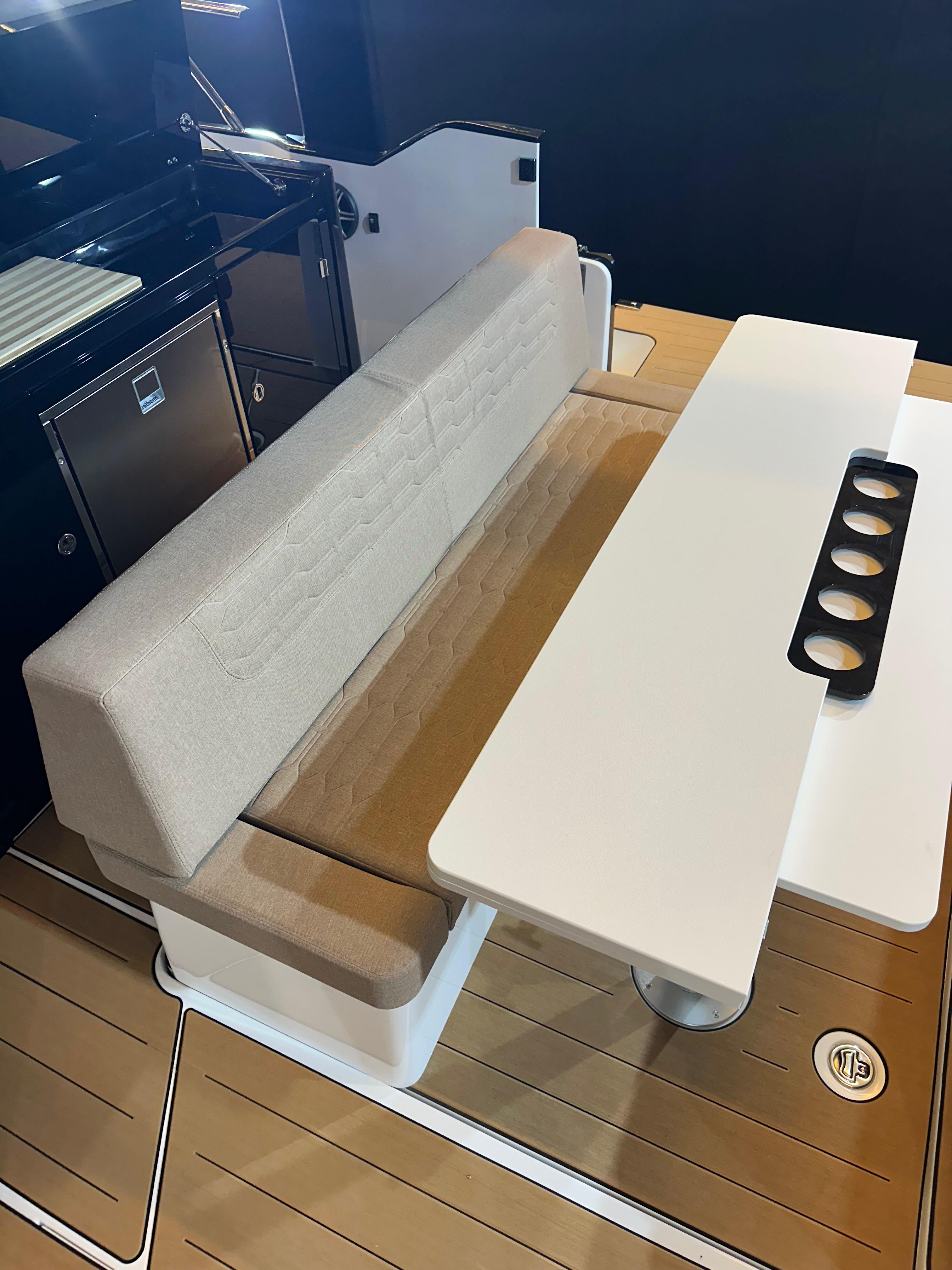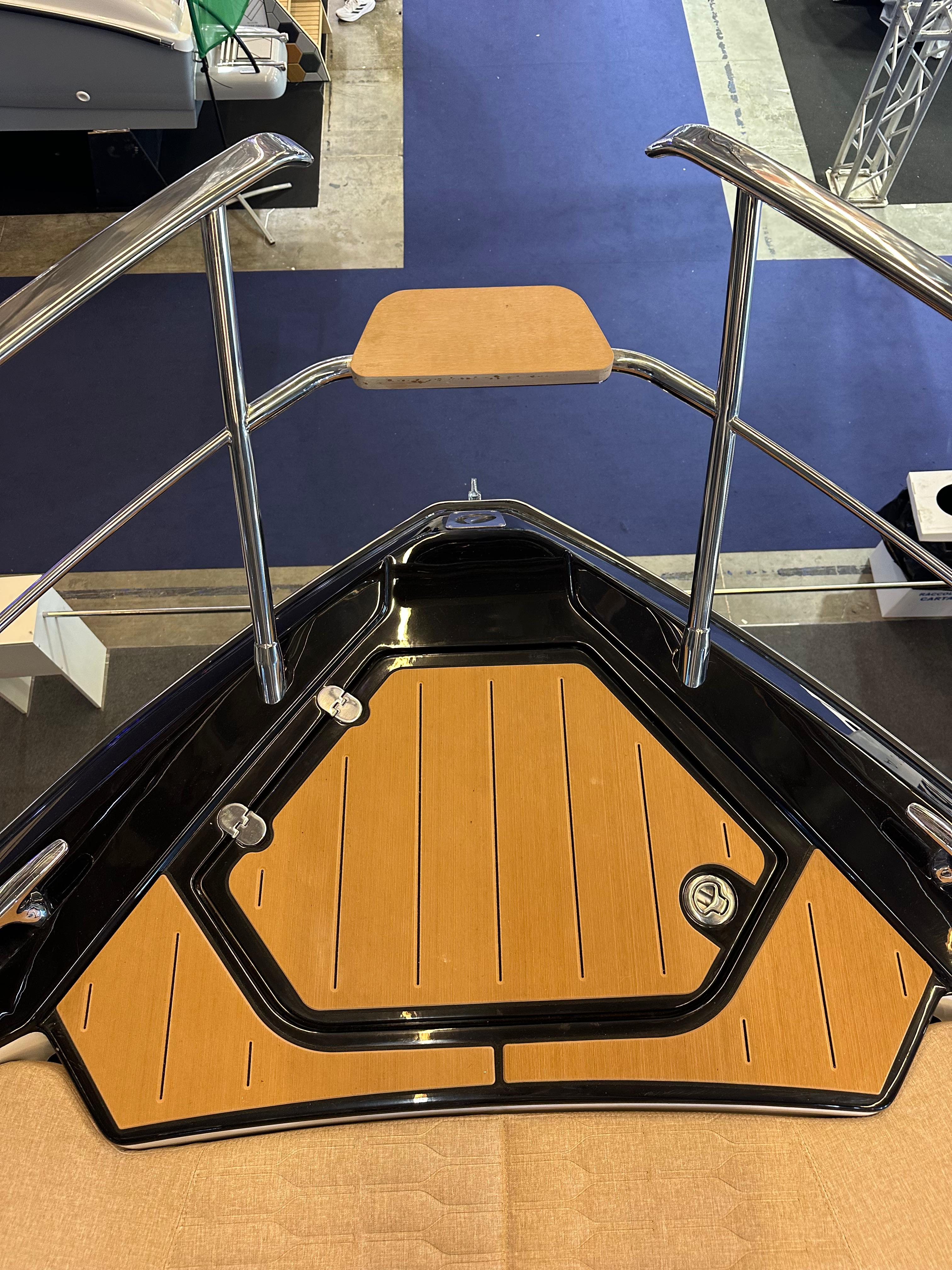 Una caratteristica innovativa e unica per un walkaround di queste dimensioni sono le terrazze laterali abbattibili (optional) - le più grandi in questa categoria di scafi - creando cosi un' estensione del pozzetto utilizzabile come comode piattaforme da bagno o zone relax. Mobile wetbar con 3 sportelli, optional: frigorifero, ice maker, piano cottura a induzione, piano cottura a gas o grill elettrico. Ampio prendisole a prua. Cabina 4 posti letto con bagno separato.