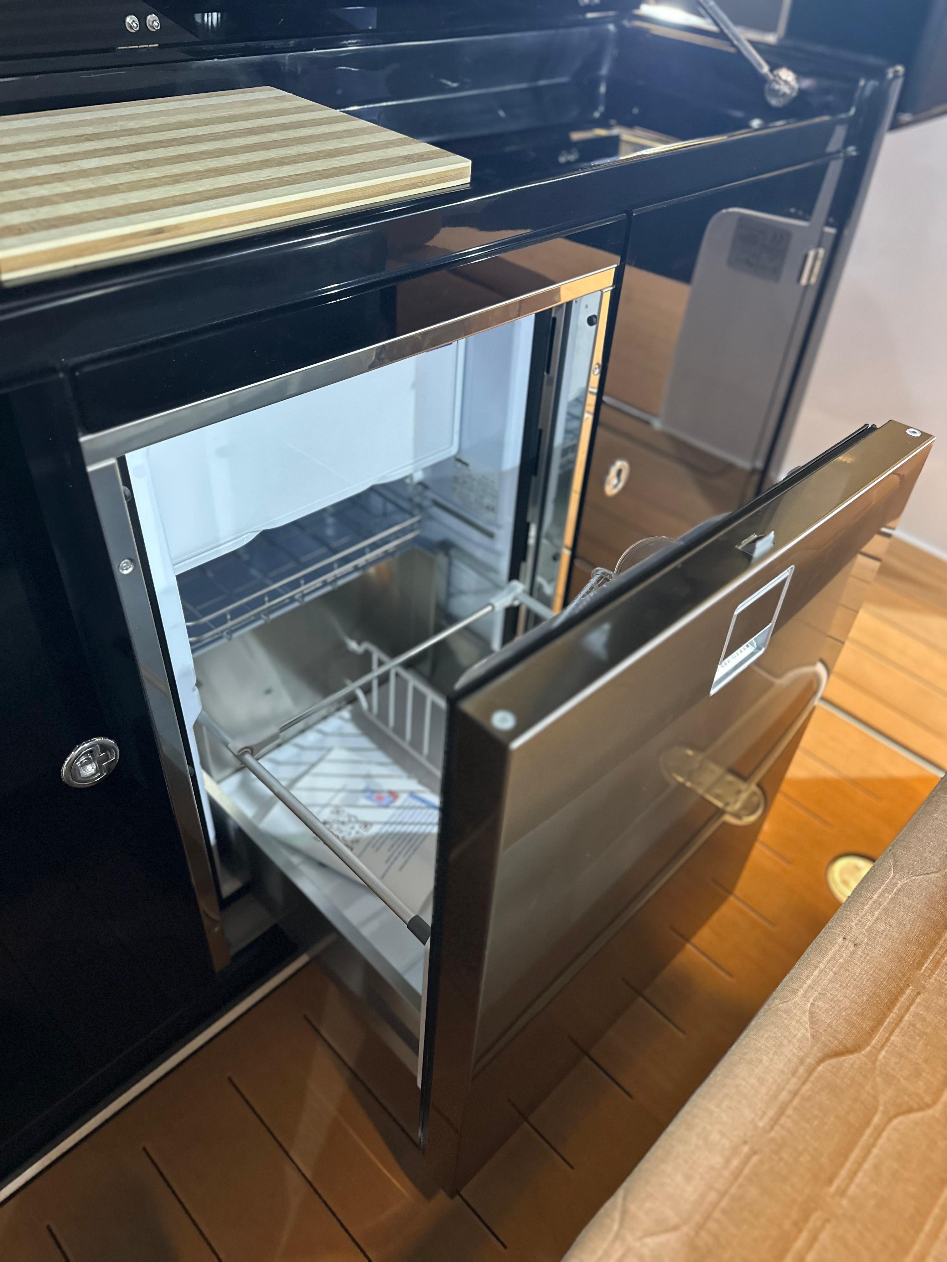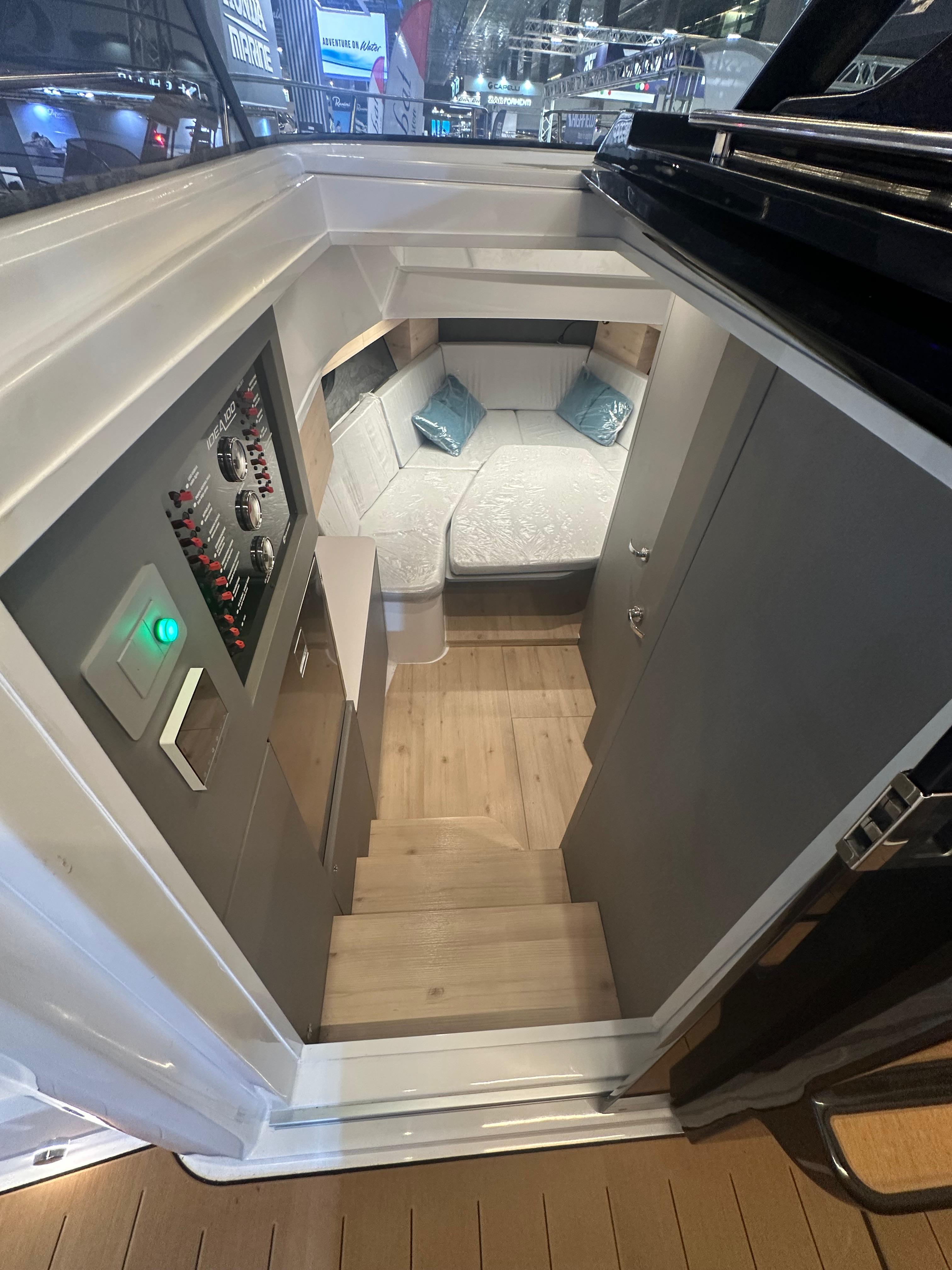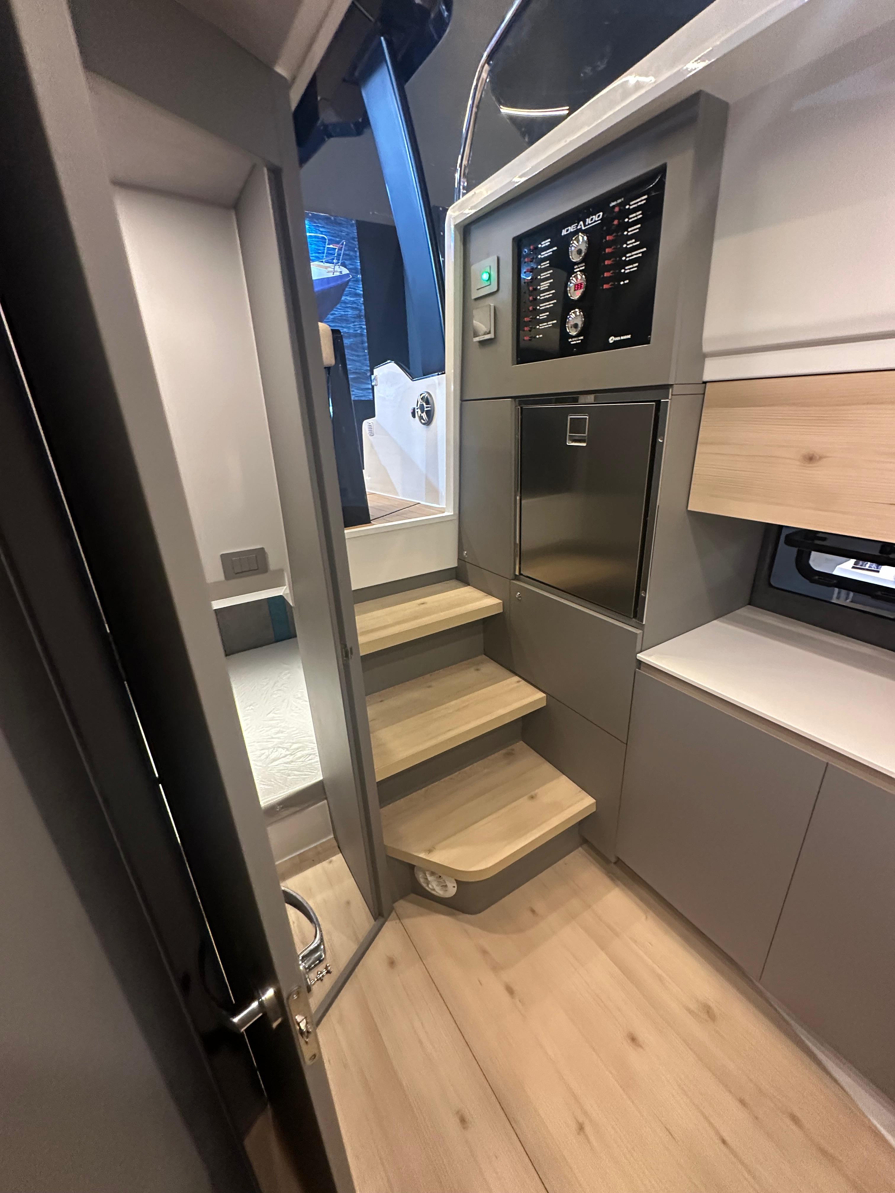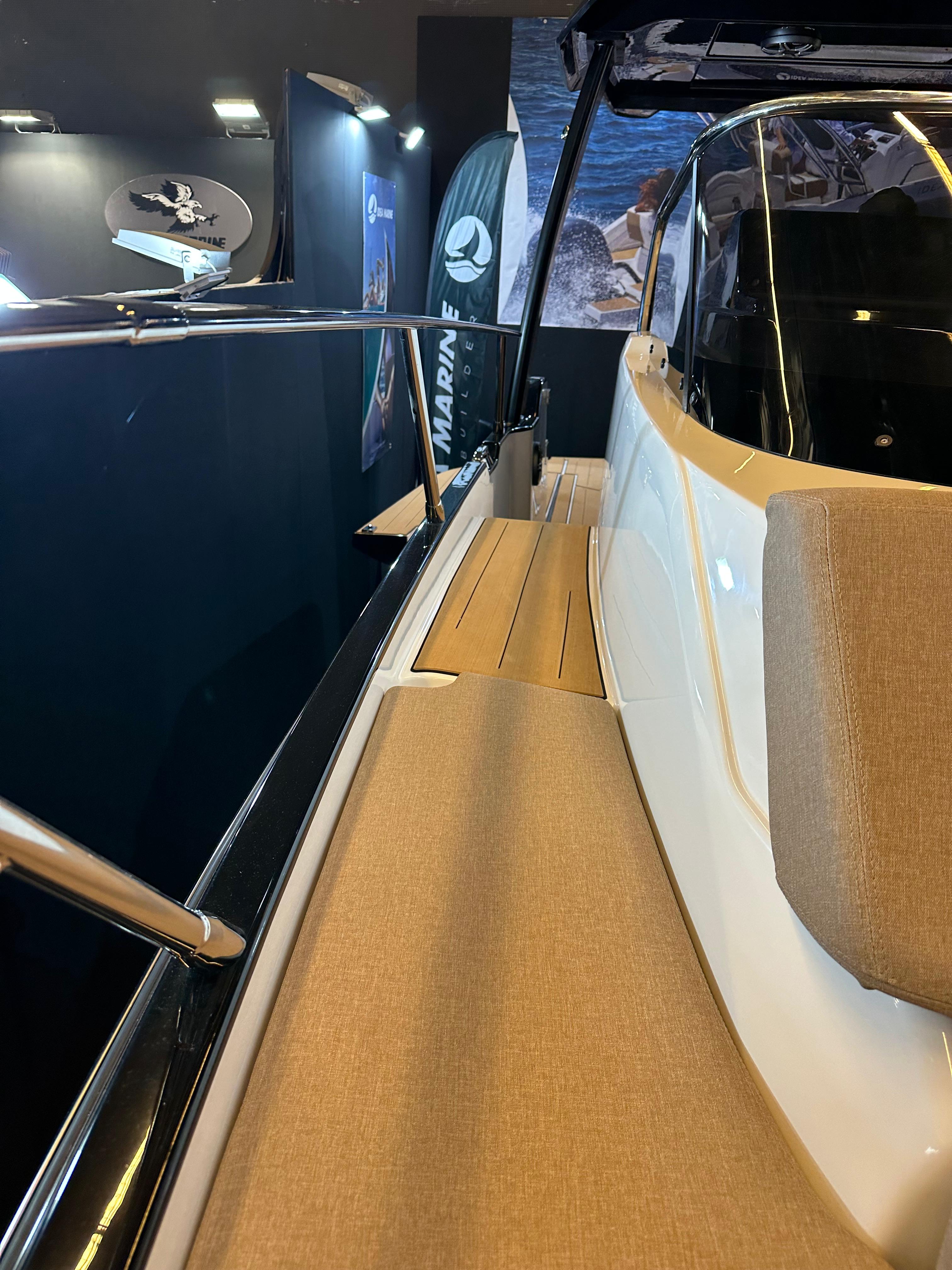 Una caratteristica innovativa e unica per un walkaround di queste dimensioni sono le terrazze laterali abbattibili (optional) - le più grandi in questa categoria di scafi - creando cosi un' estensione del pozzetto utilizzabile come comode piattaforme da bagno o zone relax. Mobile wetbar con 3 sportelli, optional: frigorifero, ice maker, piano cottura a induzione, piano cottura a gas o grill elettrico. Ampio prendisole a prua. Cabina 4 posti letto con bagno separato.