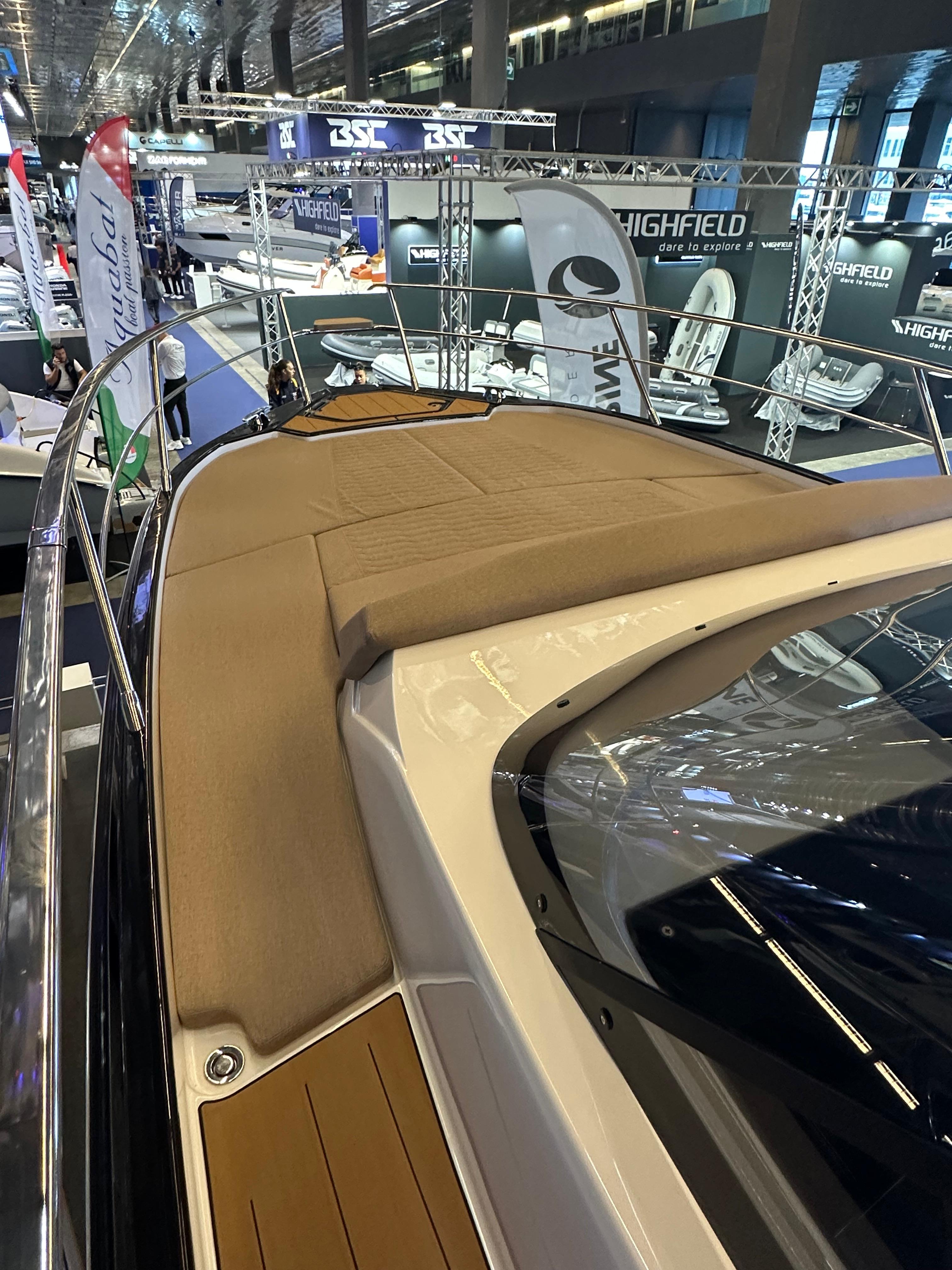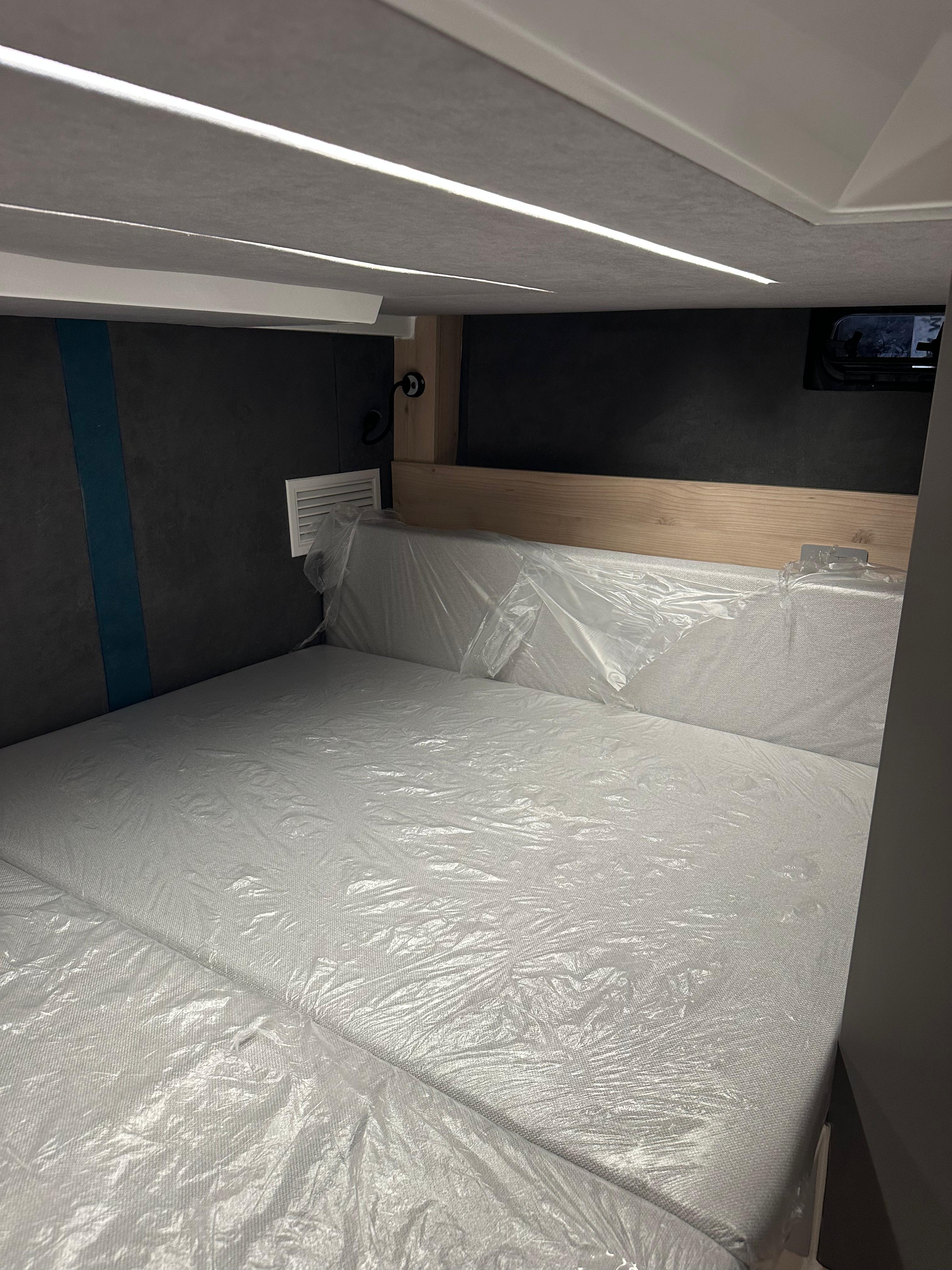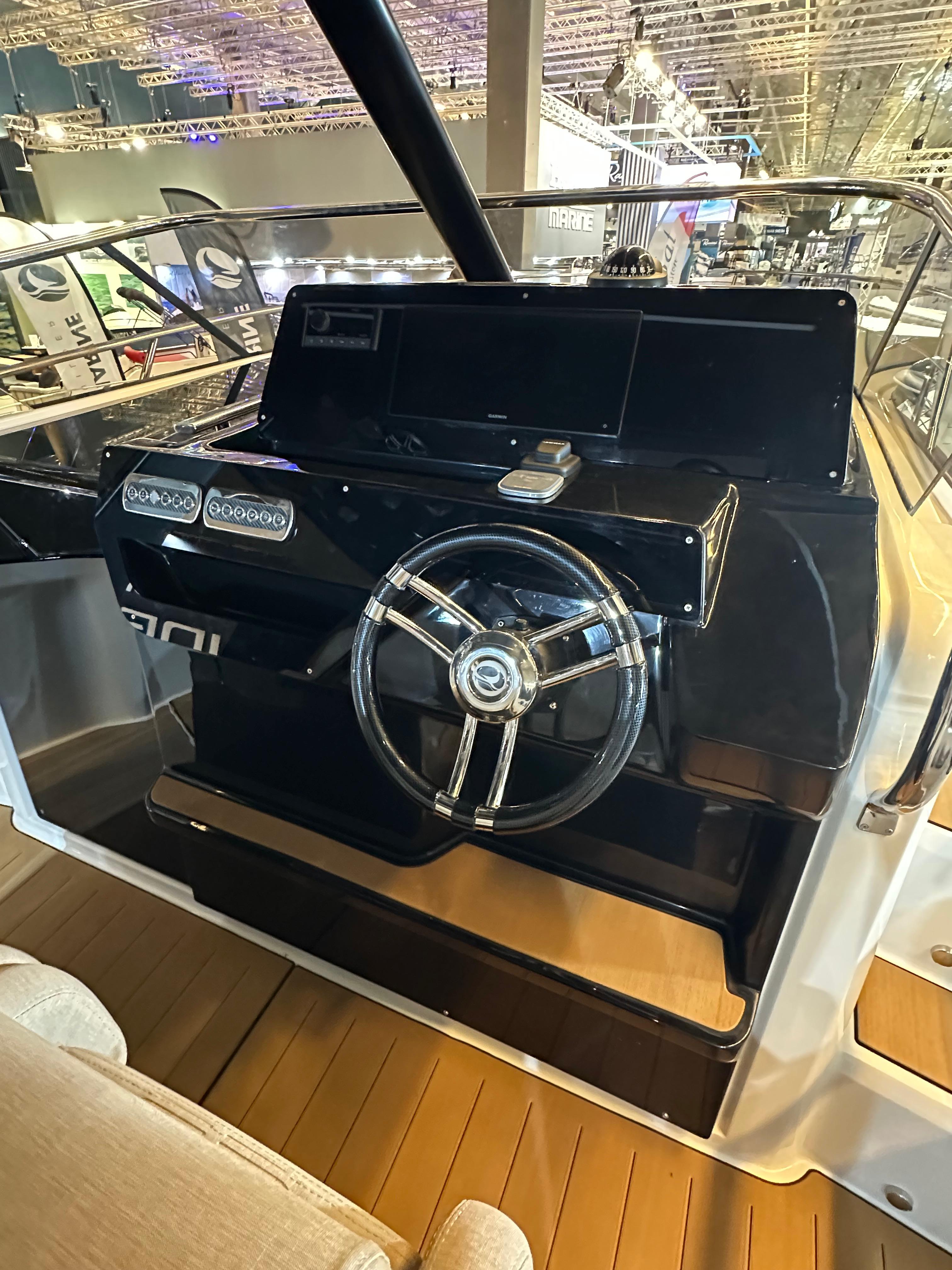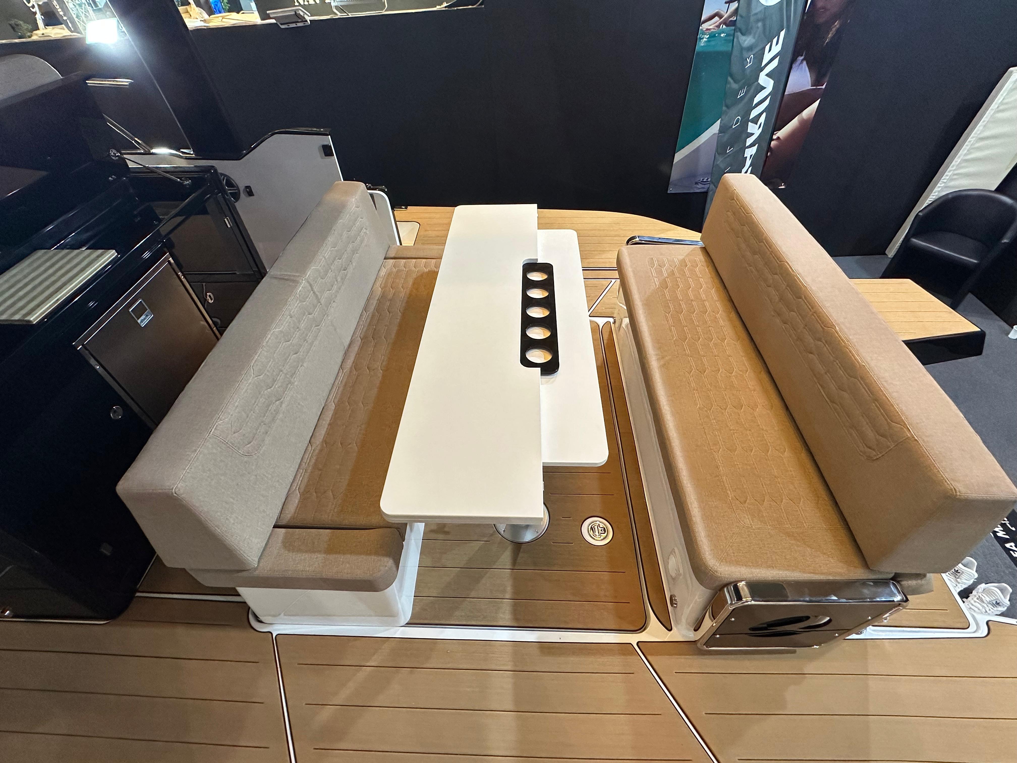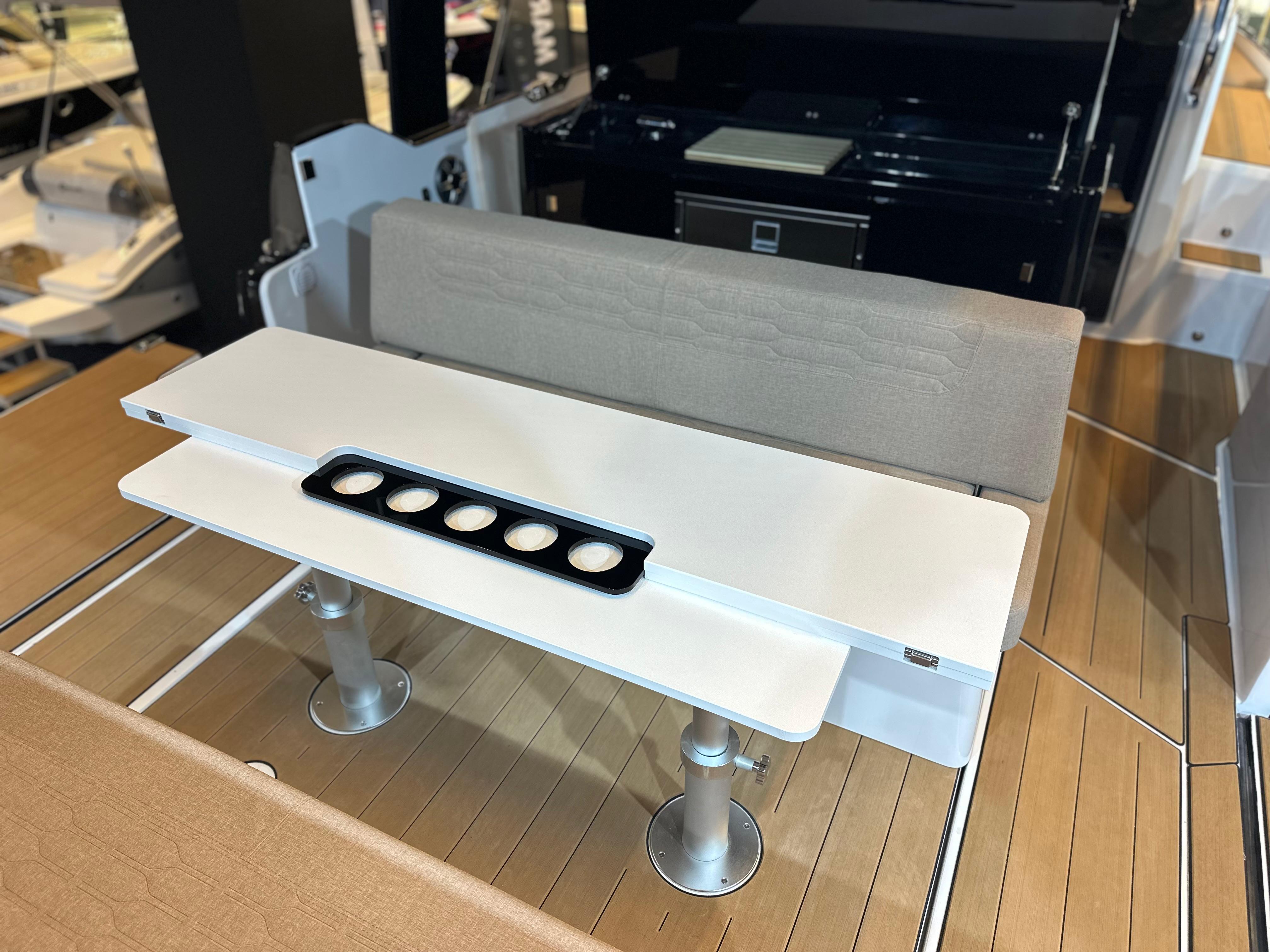 Una caratteristica innovativa e unica per un walkaround di queste dimensioni sono le terrazze laterali abbattibili (optional) - le più grandi in questa categoria di scafi - creando cosi un' estensione del pozzetto utilizzabile come comode piattaforme da bagno o zone relax. Mobile wetbar con 3 sportelli, optional: frigorifero, ice maker, piano cottura a induzione, piano cottura a gas o grill elettrico. Ampio prendisole a prua. Cabina 4 posti letto con bagno separato.