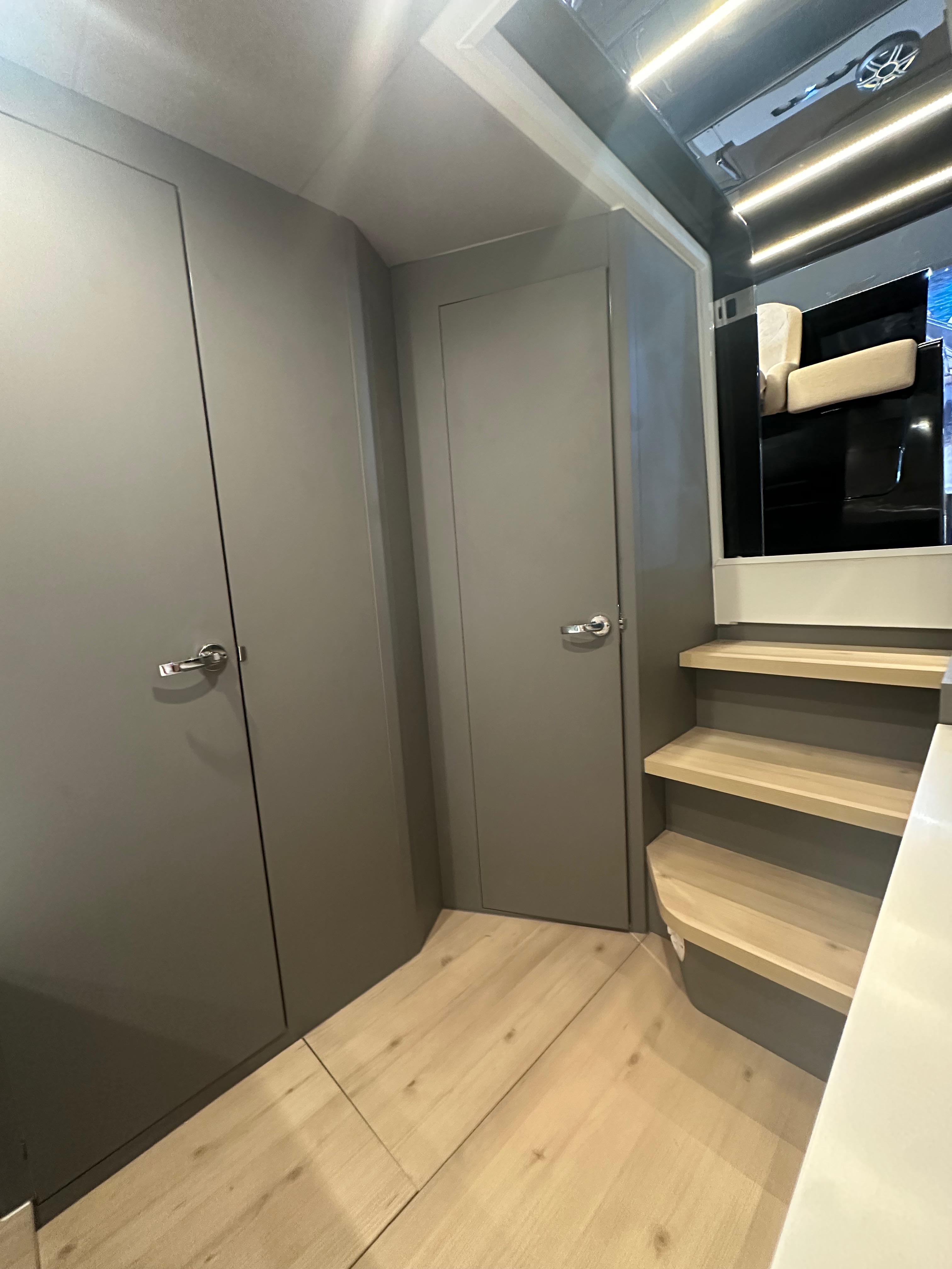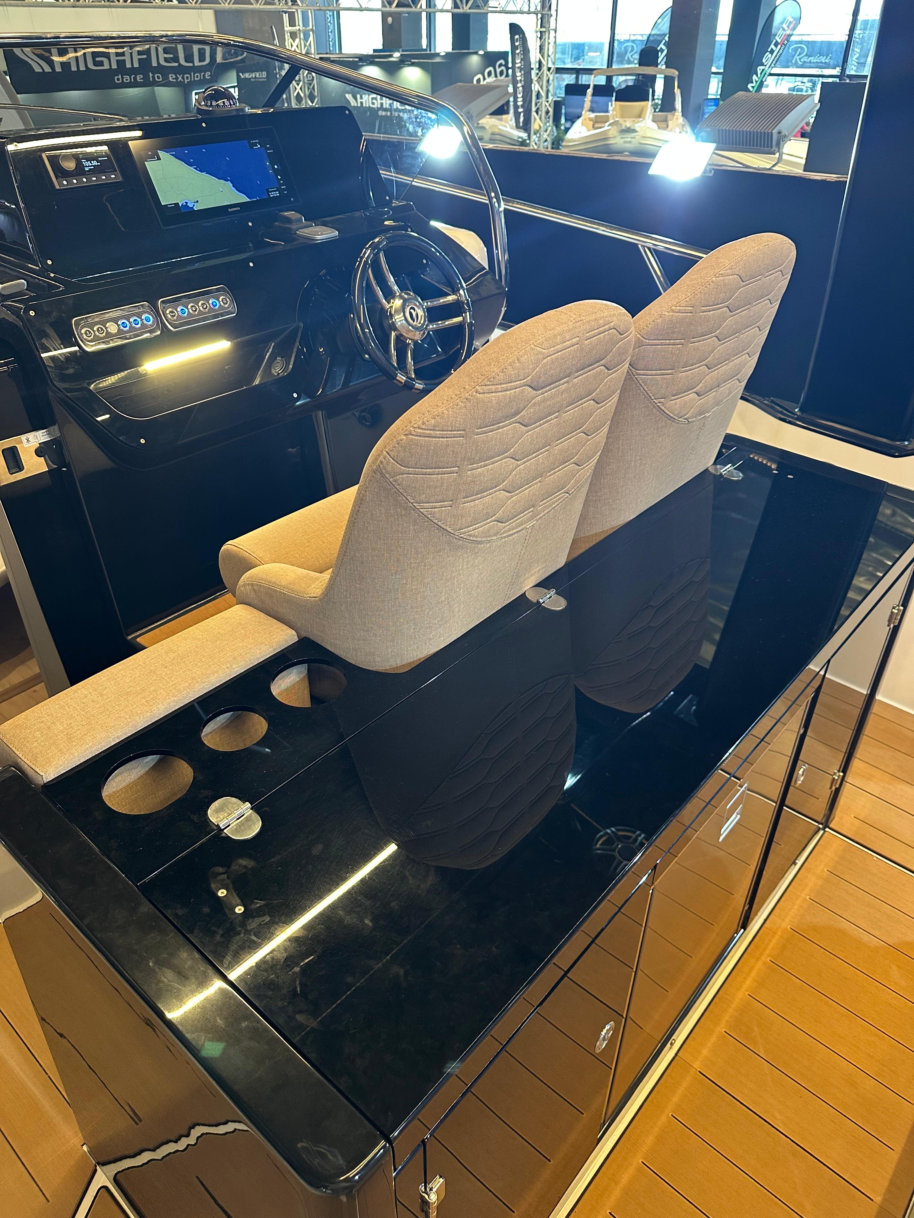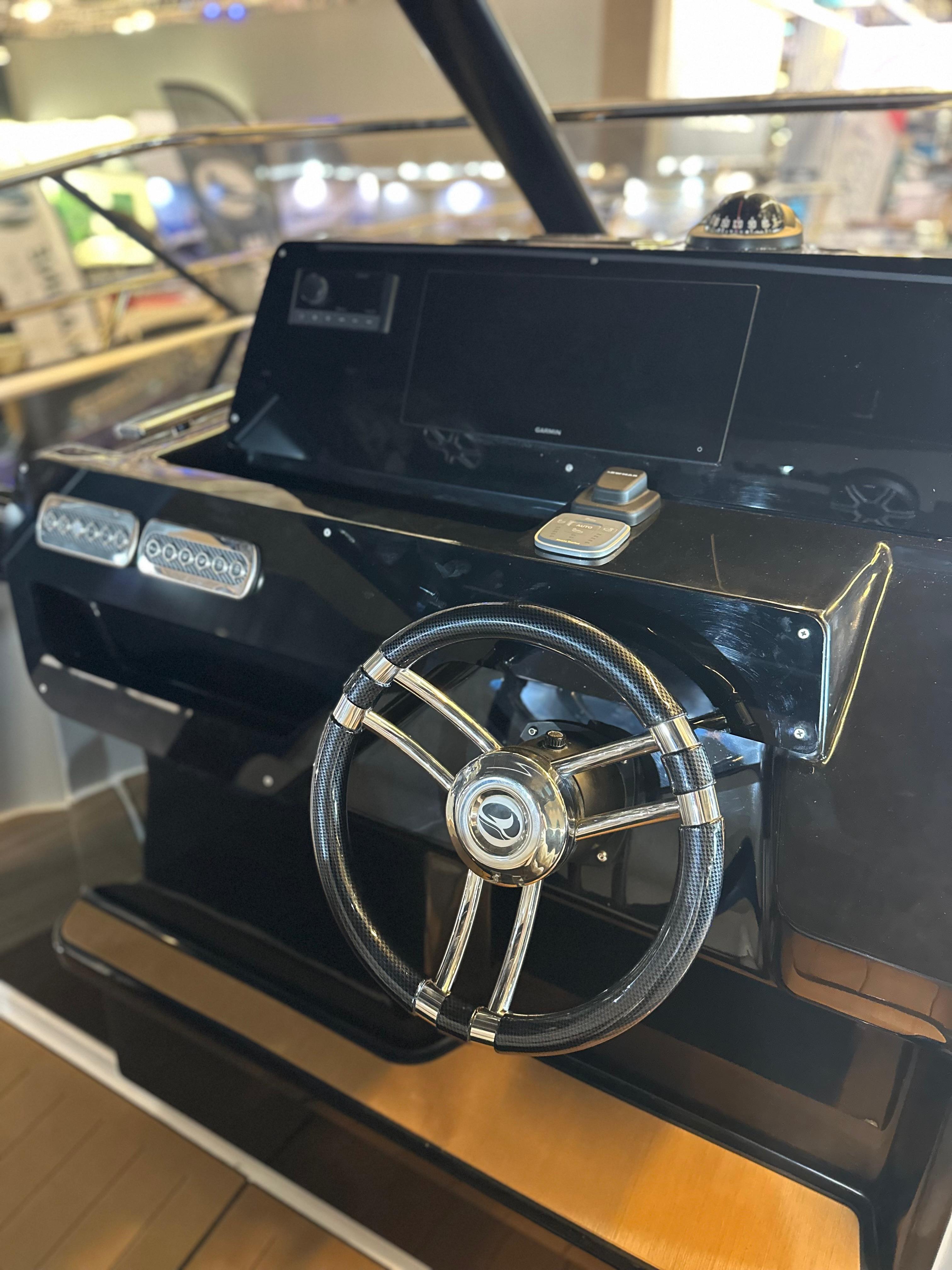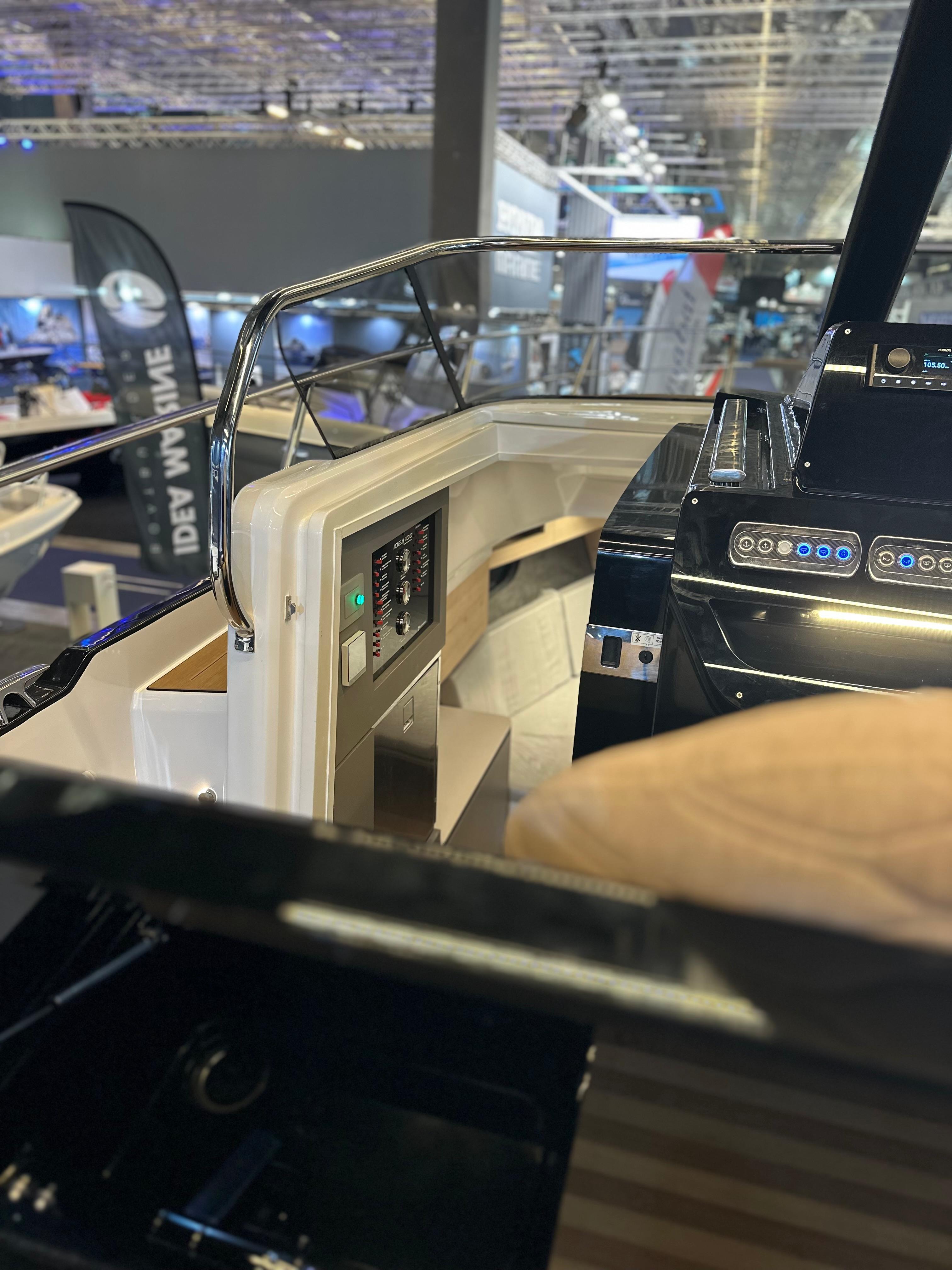 Una caratteristica innovativa e unica per un walkaround di queste dimensioni sono le terrazze laterali abbattibili (optional) - le più grandi in questa categoria di scafi - creando cosi un' estensione del pozzetto utilizzabile come comode piattaforme da bagno o zone relax. Mobile wetbar con 3 sportelli, optional: frigorifero, ice maker, piano cottura a induzione, piano cottura a gas o grill elettrico. Ampio prendisole a prua. Cabina 4 posti letto con bagno separato.