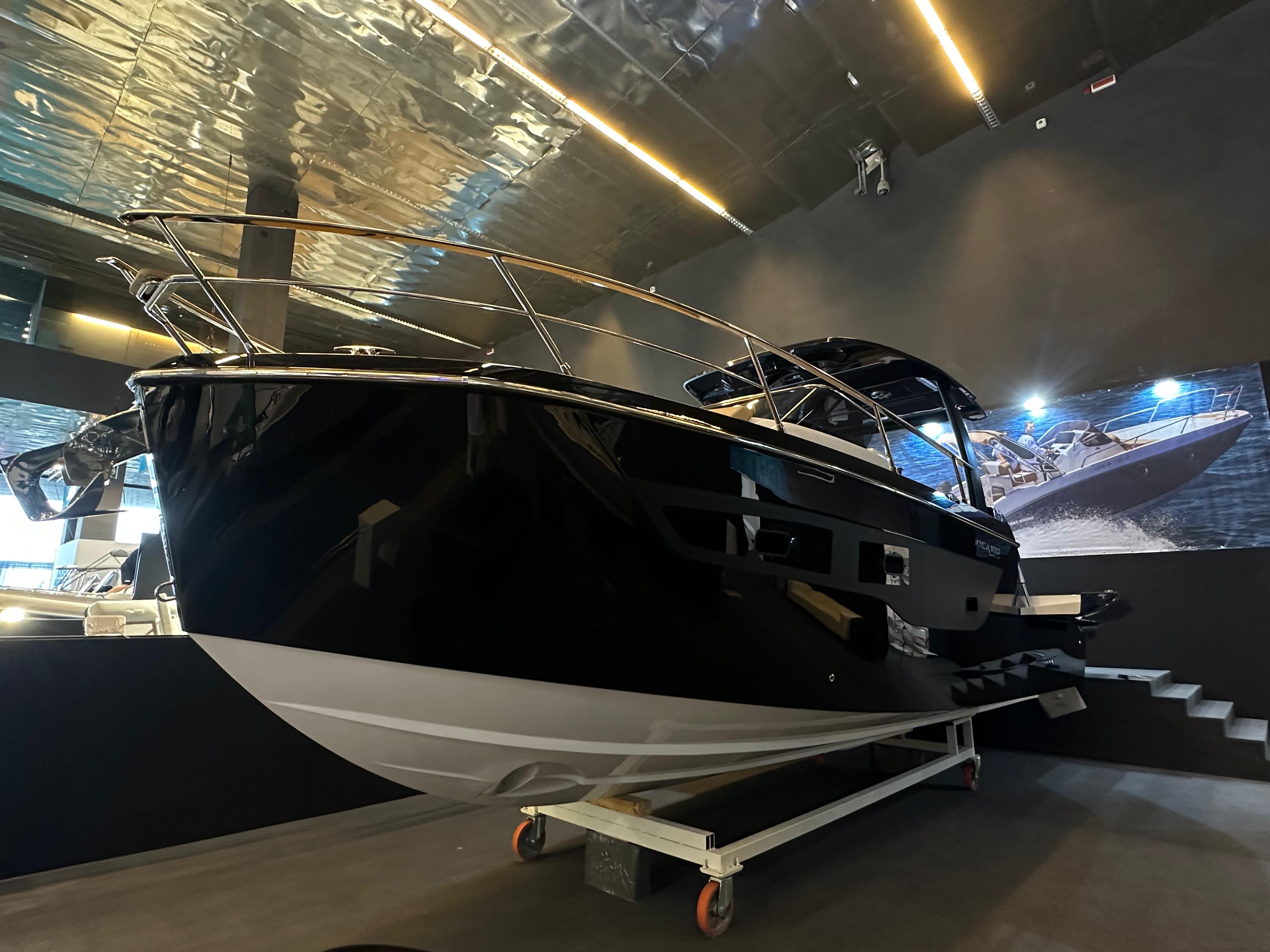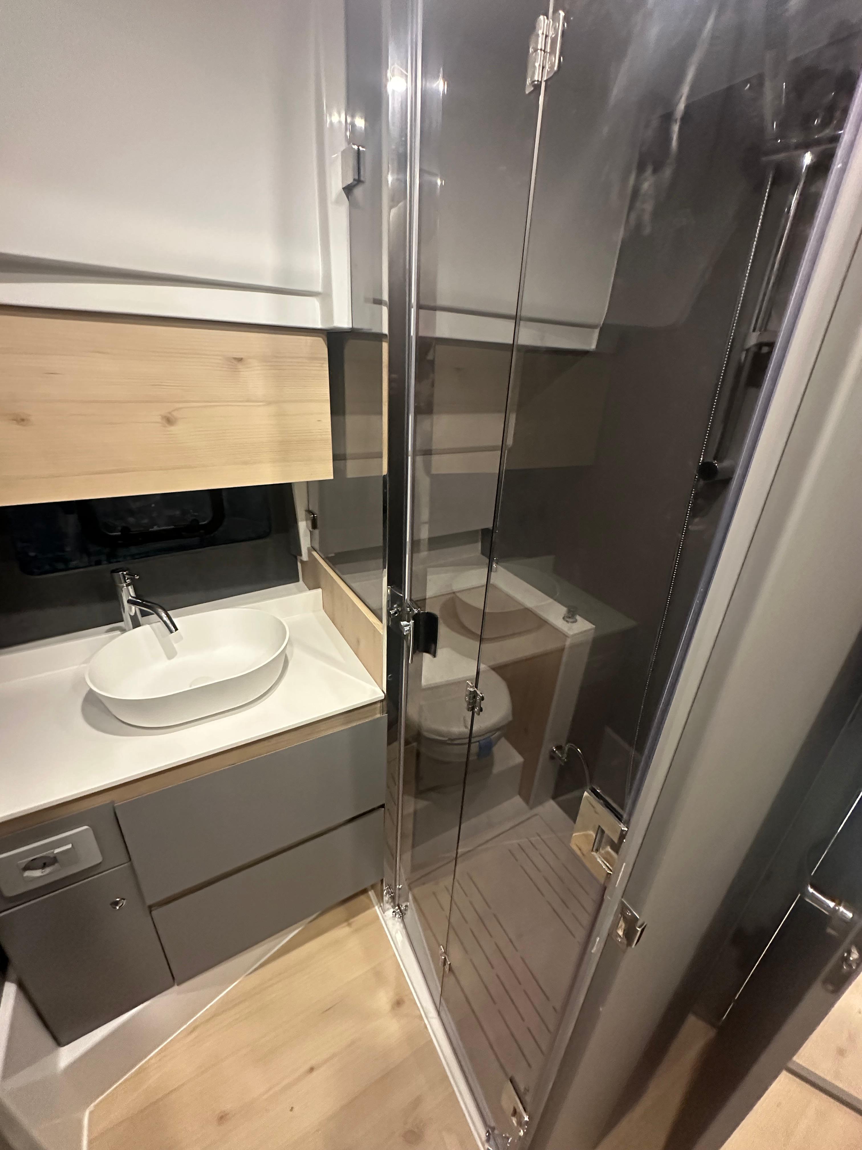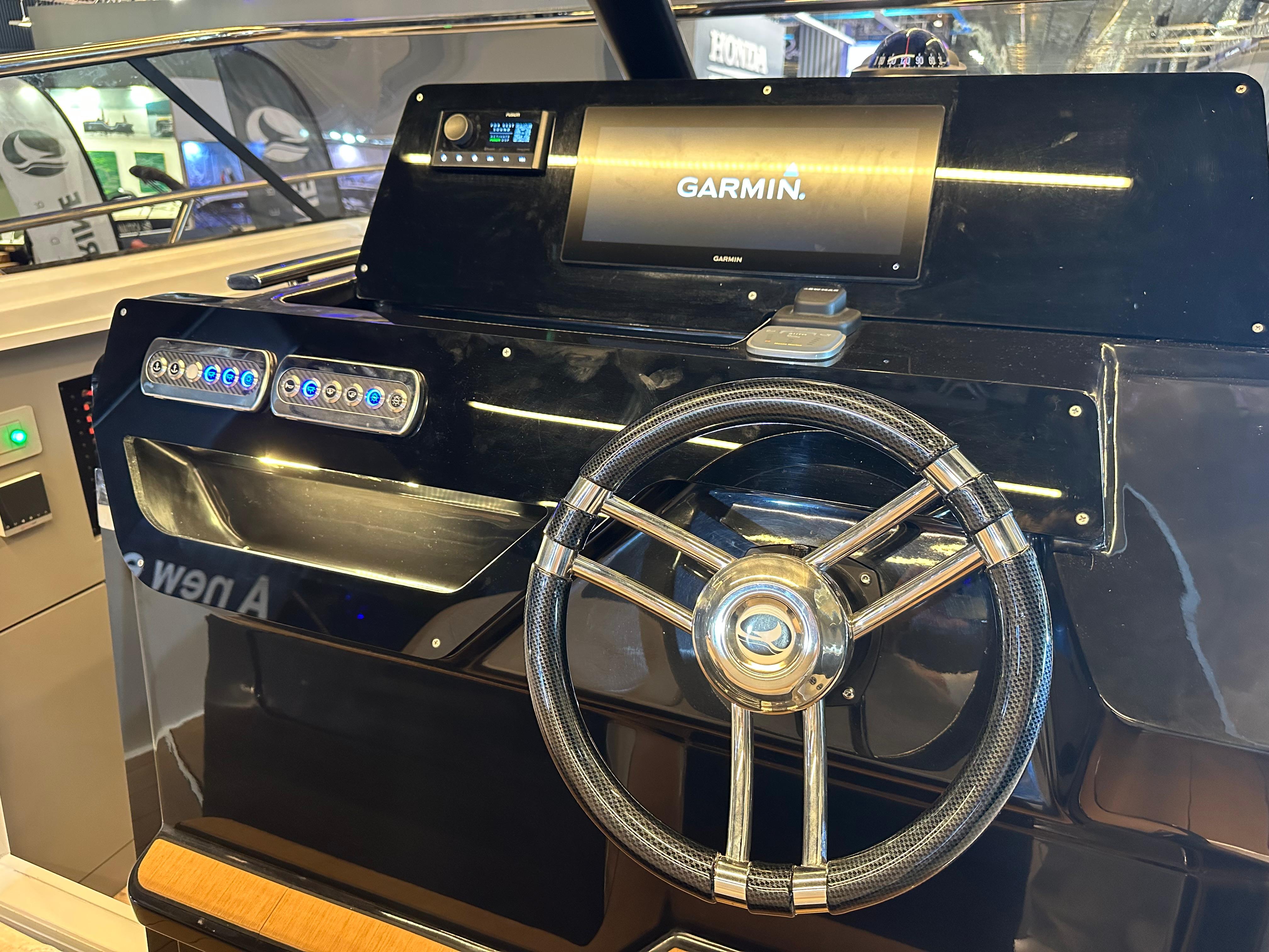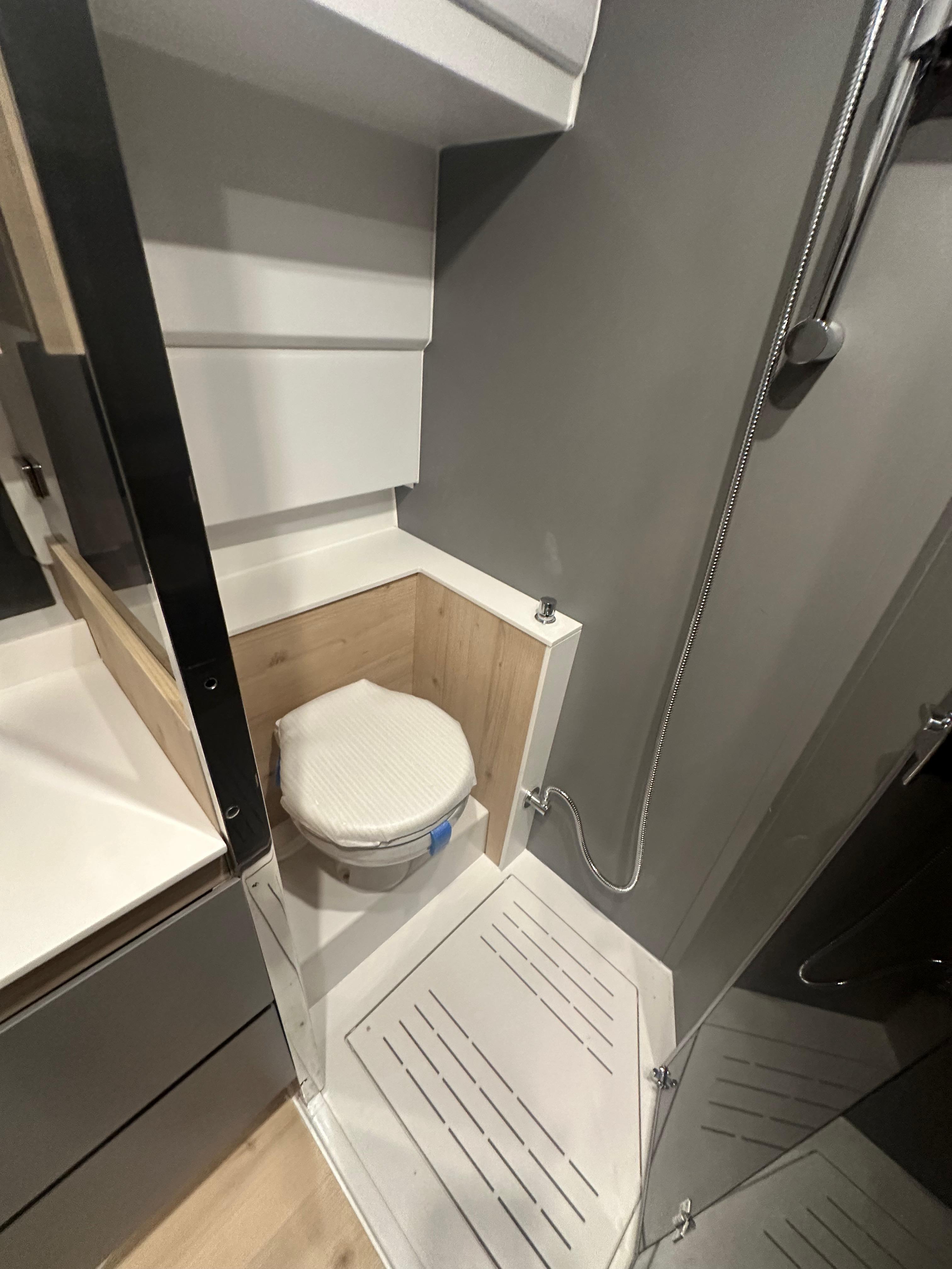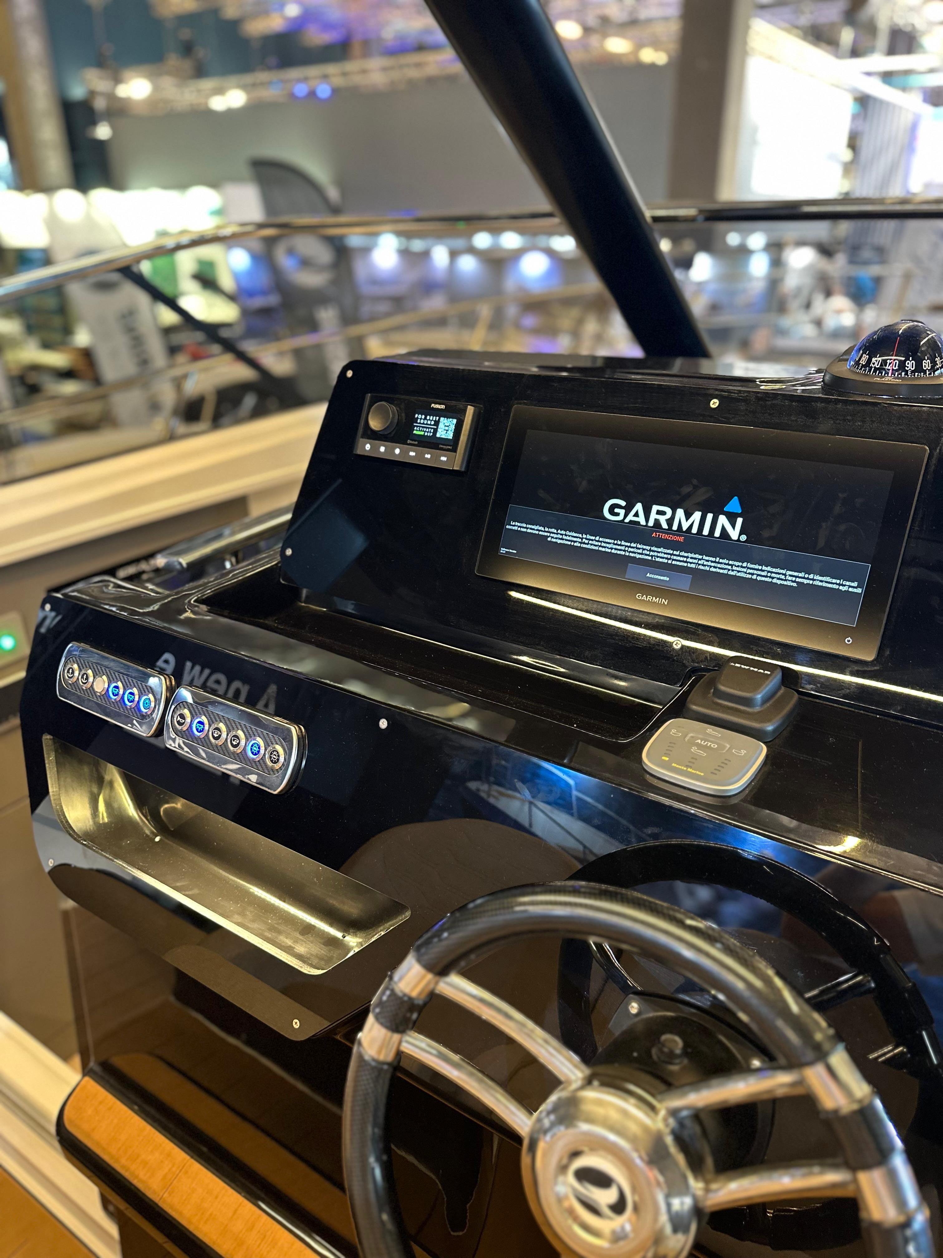 Una caratteristica innovativa e unica per un walkaround di queste dimensioni sono le terrazze laterali abbattibili (optional) - le più grandi in questa categoria di scafi - creando cosi un' estensione del pozzetto utilizzabile come comode piattaforme da bagno o zone relax. Mobile wetbar con 3 sportelli, optional: frigorifero, ice maker, piano cottura a induzione, piano cottura a gas o grill elettrico. Ampio prendisole a prua. Cabina 4 posti letto con bagno separato.