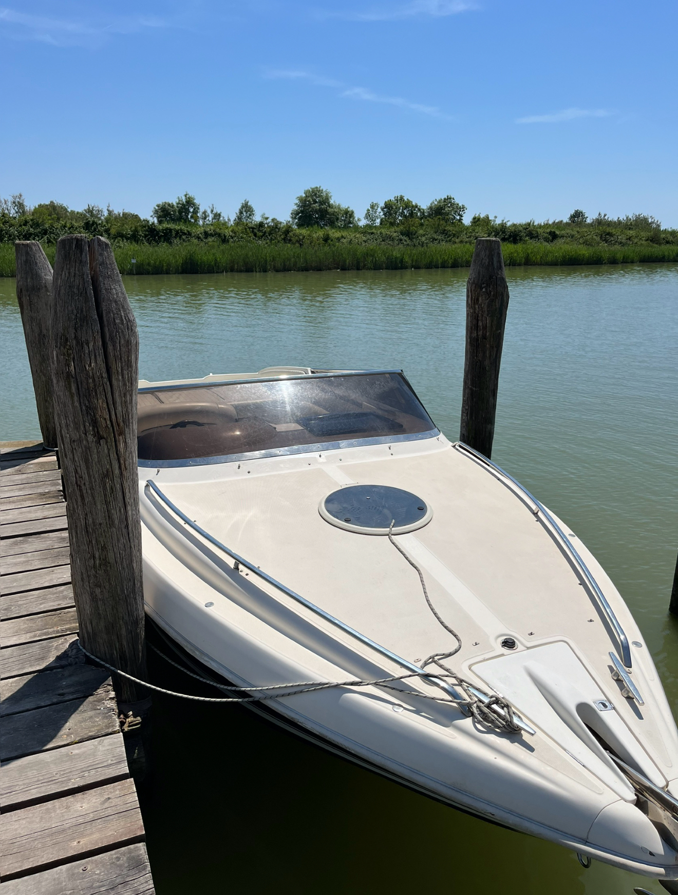 Imbarcazione sportiva con ampio spazio prendisole a poppa e prua.