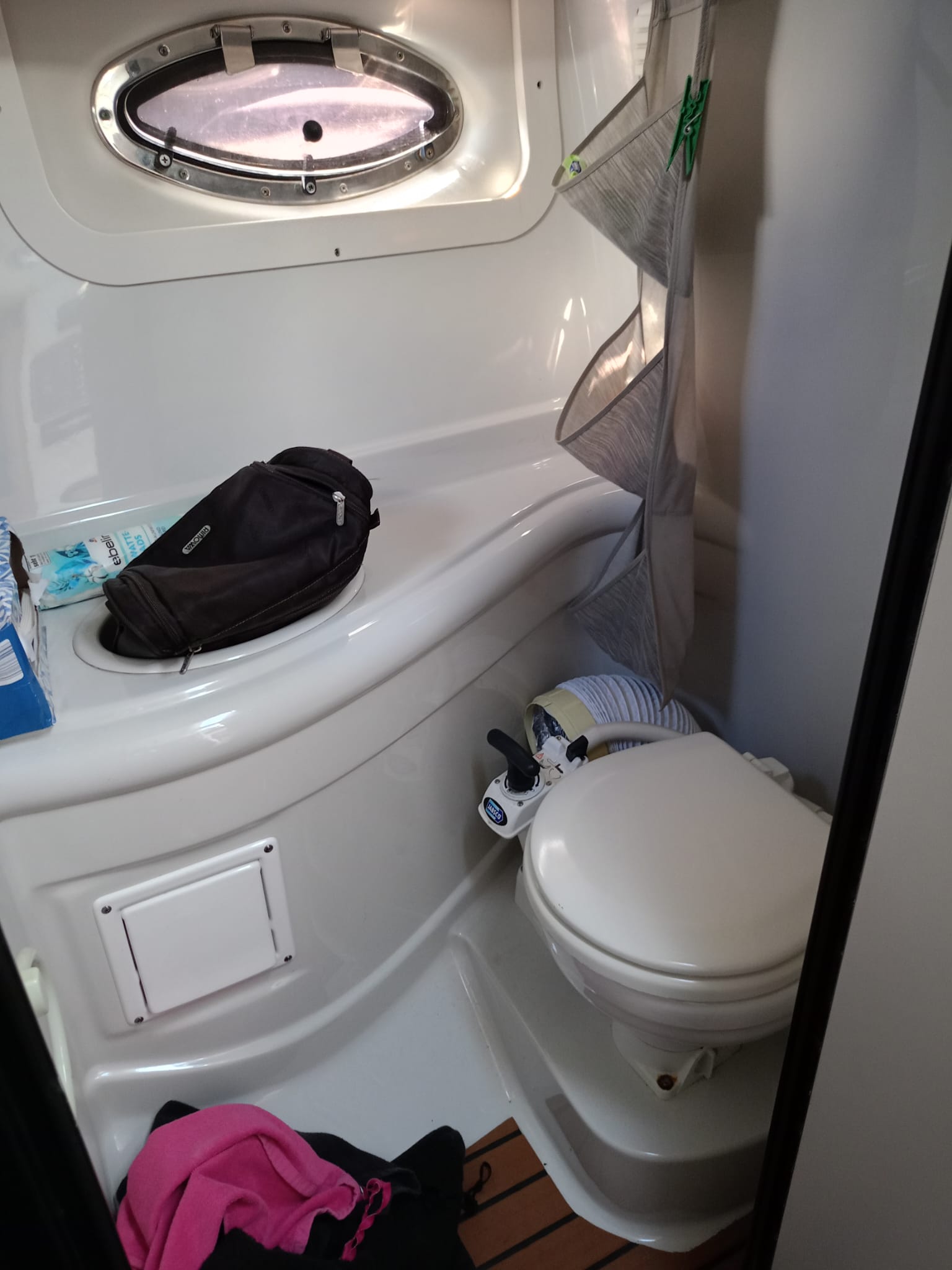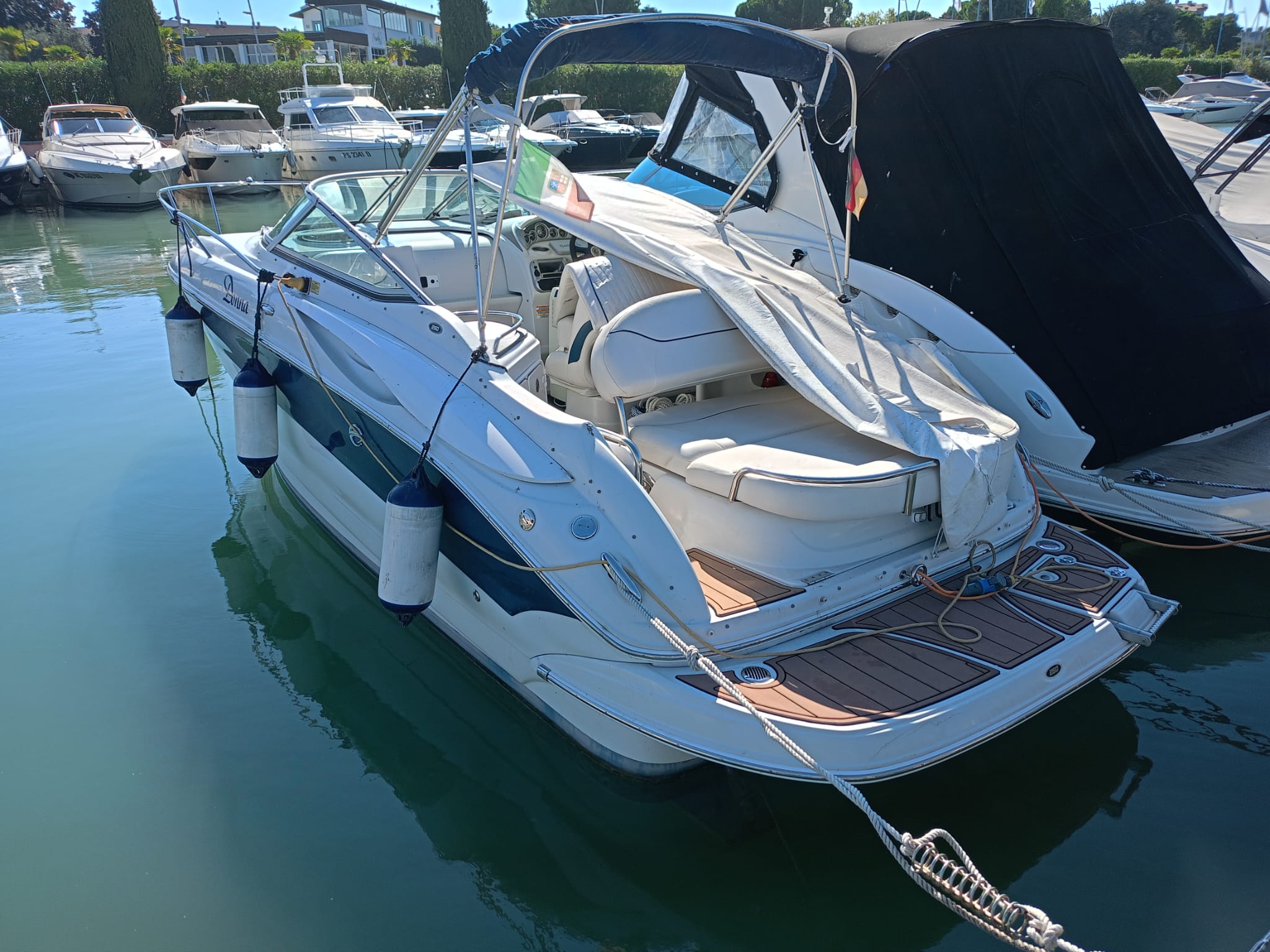 telo copriscafo, tendalino sole in acciaio, ampio prendisole a poppa, WC marino, radio/stereo, microonde, frigorifero, rivestimento pozzetto e plancetta teak sintetico.