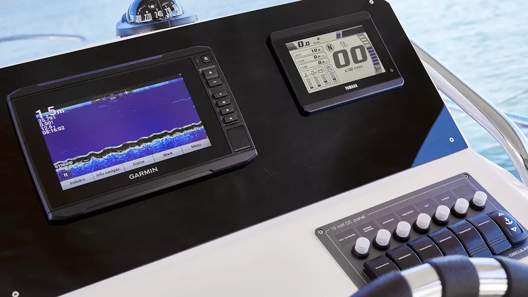 Impianto stereo Fusion, RA60KCWBLUETOOTH con 2 altoparlanti fusion 6", pannello utenze con impianto, frigorifero elettrico con incasso, verricello elettrico con catena ed ancora, tromba elettrica, plancette di poppa in vetroresina, doppio impianto batteria.