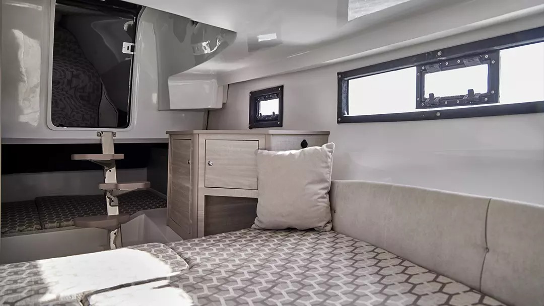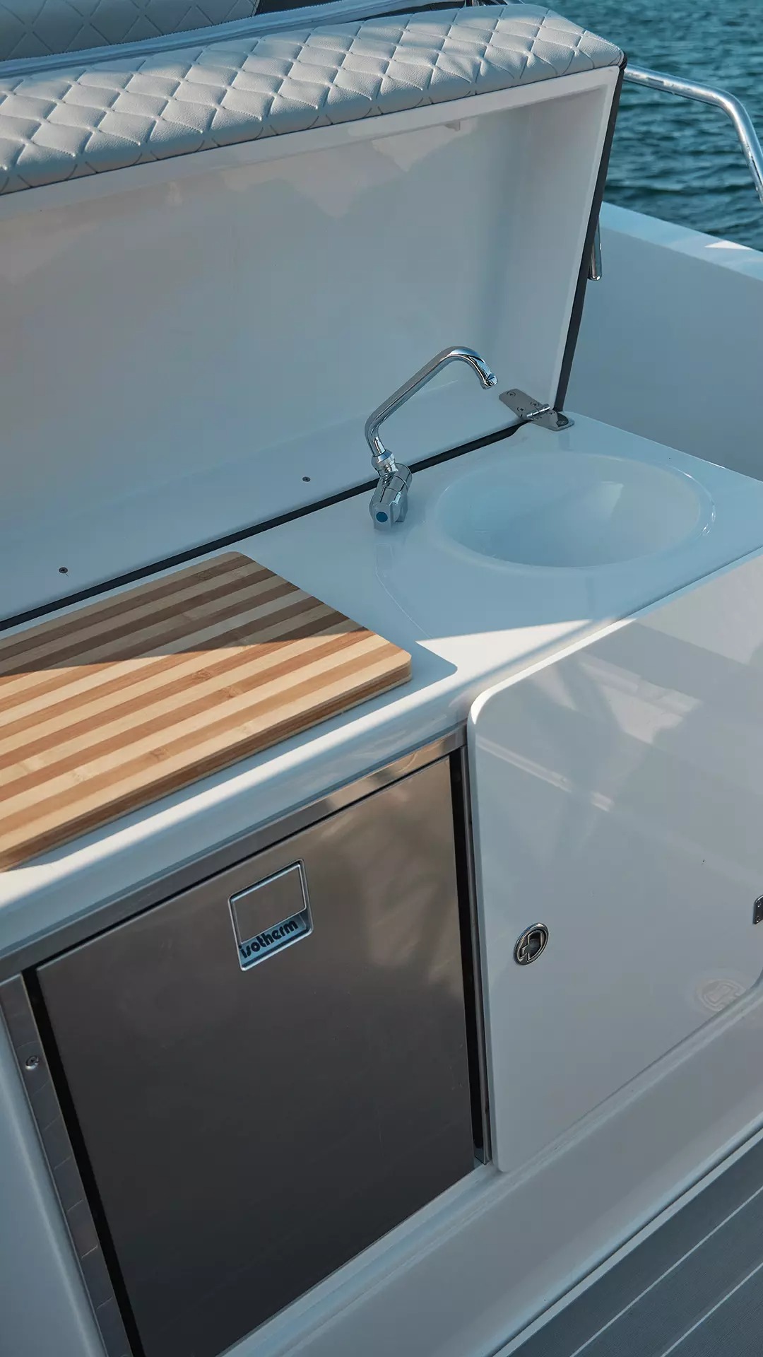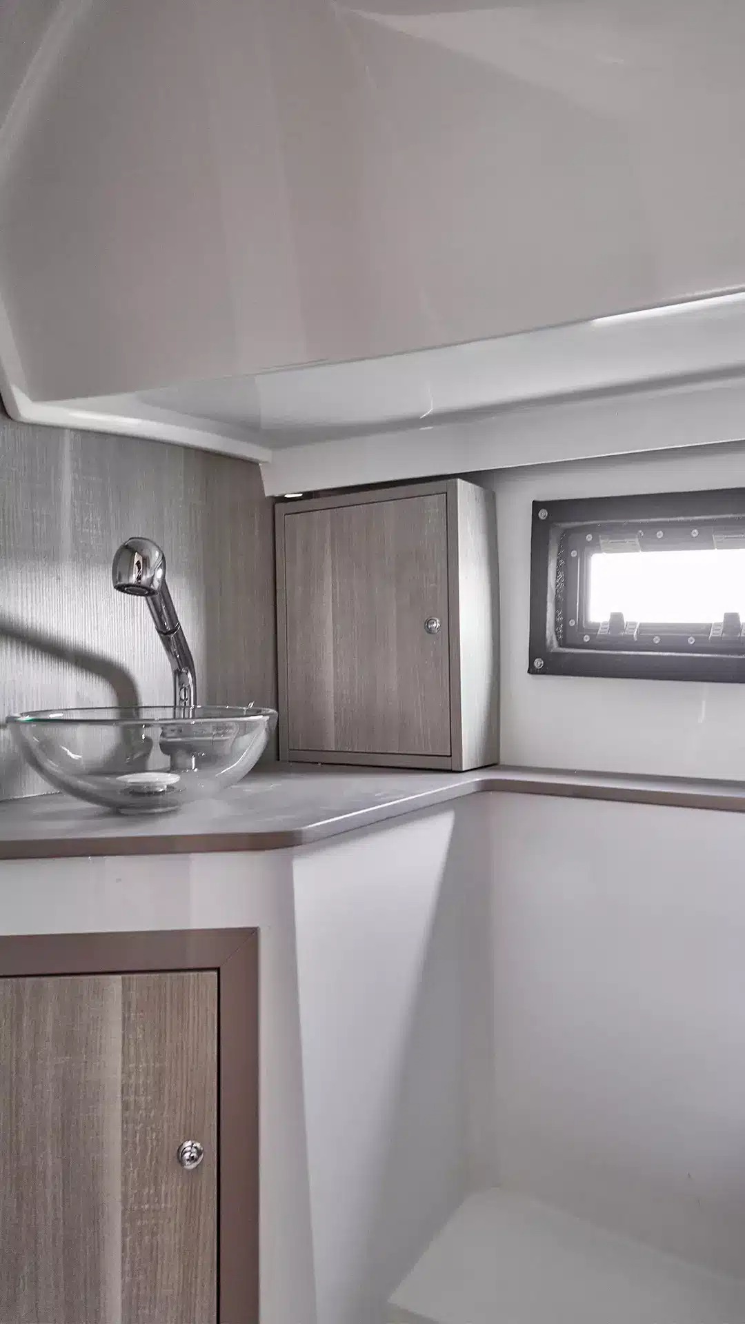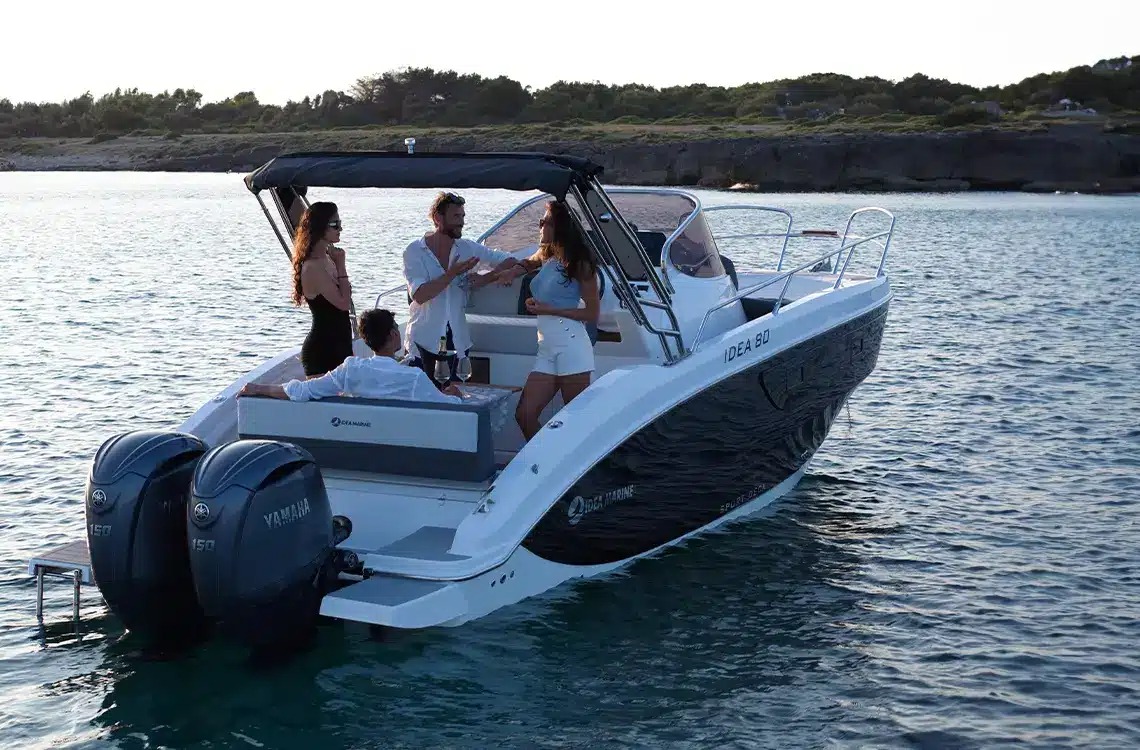 IDEA 80 WA è un walk-around spazioso e moderno, ideale per chi cerca comfort e prestazioni in famiglia o con amici. Lo scafo bianco abbinato alla cuscineria Olympus light candido / Silvertex beige dona eleganza e luminosità agli ambienti, mentre gli ampi spazi prendisole e il pozzetto vivibile la rendono perfetta per uscite giornaliere e brevi crociere.