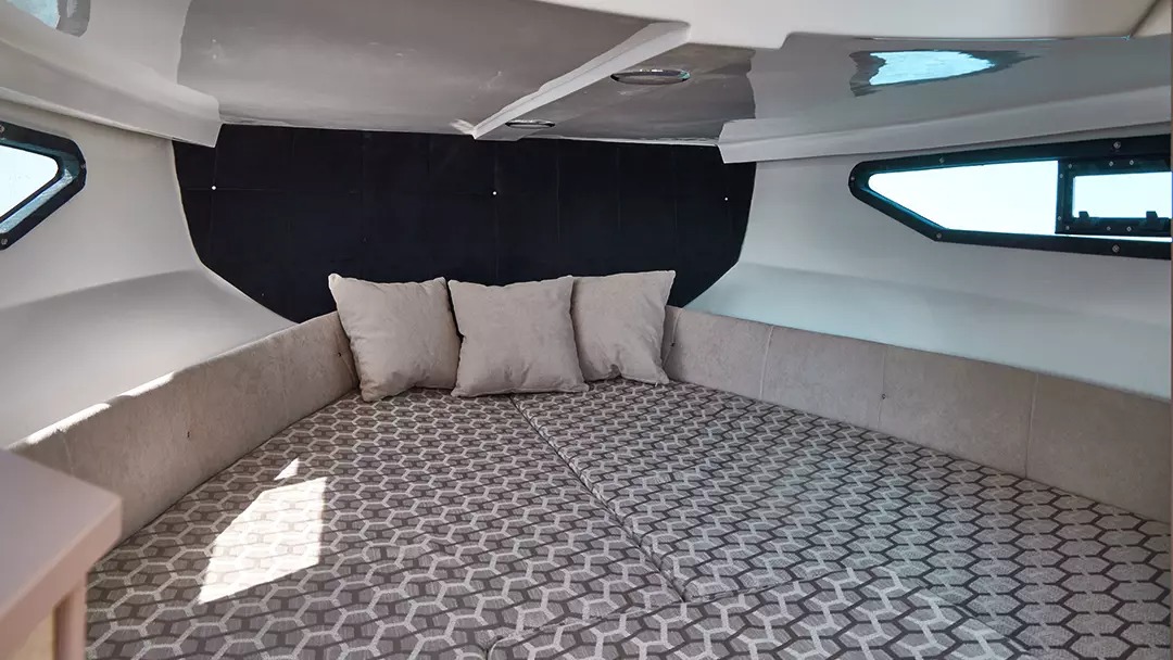 Cuscineria interna ed esterna, testiere in velluto, mobile stand - up con lavello e tagliere, doccia esterna, bussola ad incasso, mobili in legno in cabina, mobile completo di lavello e rubinetto estraibile per doccia, armadietti alti, cabina di poppa, pannello utenze con impianto elettrico, timoneria idraulica, luci di via, 2 luci in cabina, 2 pompe di sentina, tientibene e golfari, scaletta inox, 4 oblò in cabina, serbatoio carburante con galleggiante 277lt.
