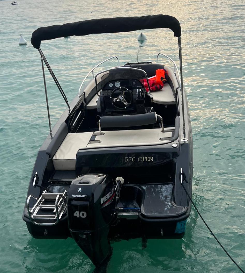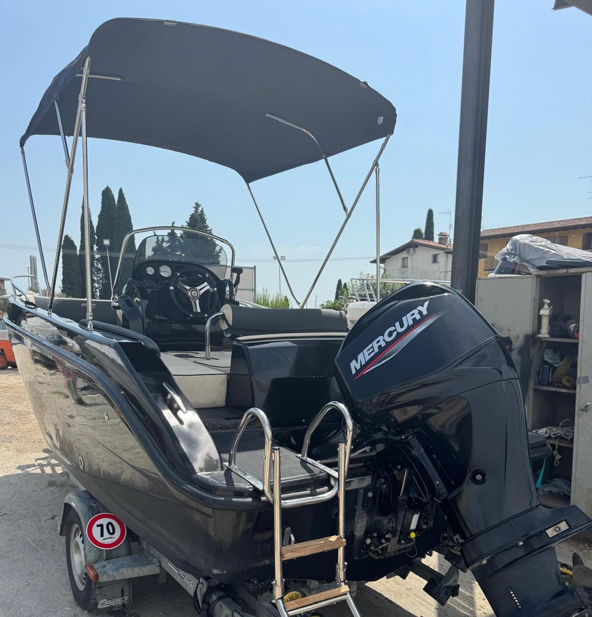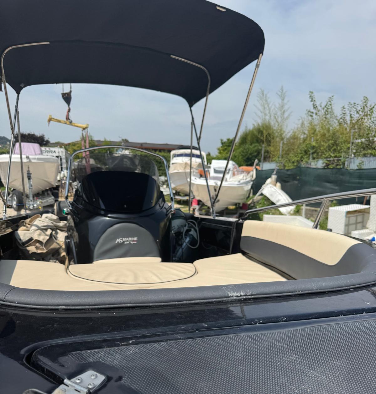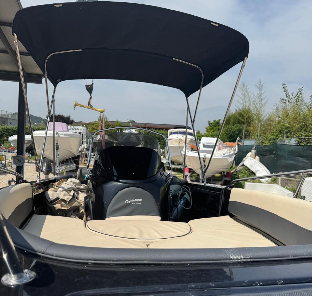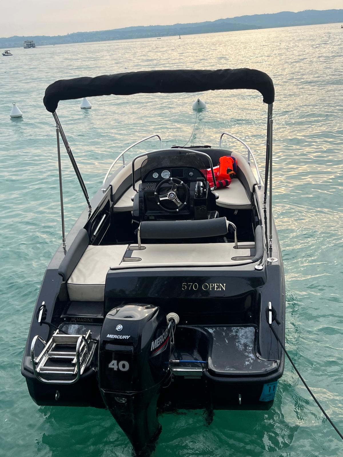 AS Marine 570 Full Black usata (2021) in ottime condizioni, abbinata a motore Mercury F40 ELPT EFI 40 cv con centralina ECM (potenza omologata 40/60 cv). Barca open usata solo in acqua dolce, rimessata in secca durante l’inverno, in vendita per cambio categoria. Ampio prendisole di prua, seduta fronte console, seduta di guida con schienale regolabile per formare un'altro prendisole di poppa.